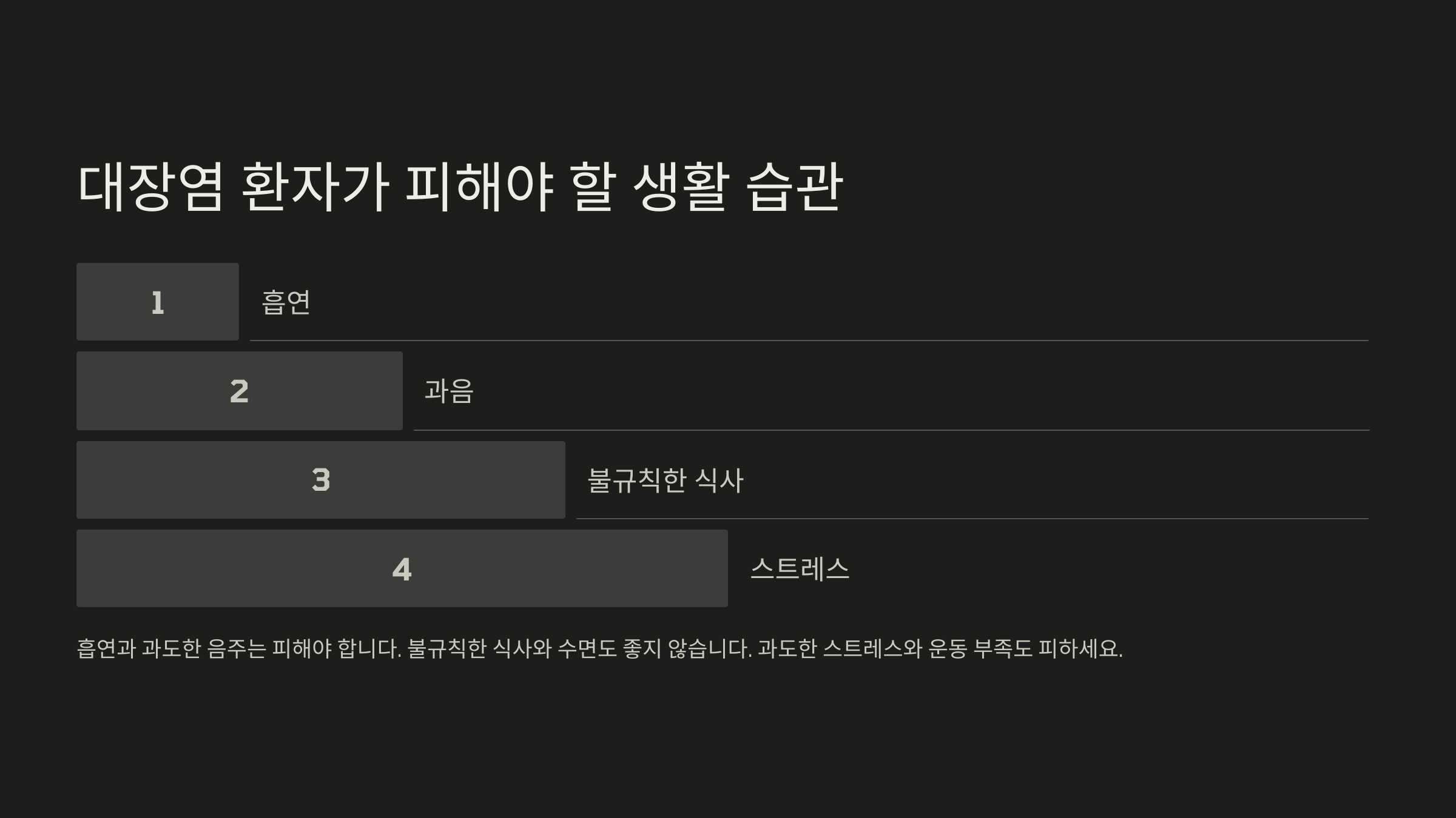 다음으로, 대장염 환자가 피해야 할 생활 습관을 알아볼까요? 🚫