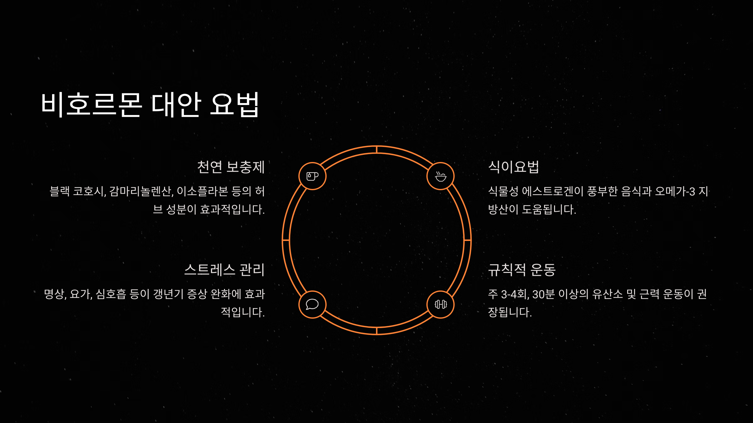 호르몬 치료가 부담스럽거나 건강 상태상 맞지 않는 경우도 있어요. 이런 분들을 위해 '비호르몬 대안 요법'이 있어요. 자연스러운 방법으로 증상을 완화하거나, 식이요법·운동·보충제 등을 활용해 갱년기를 관리할 수 있답니다.