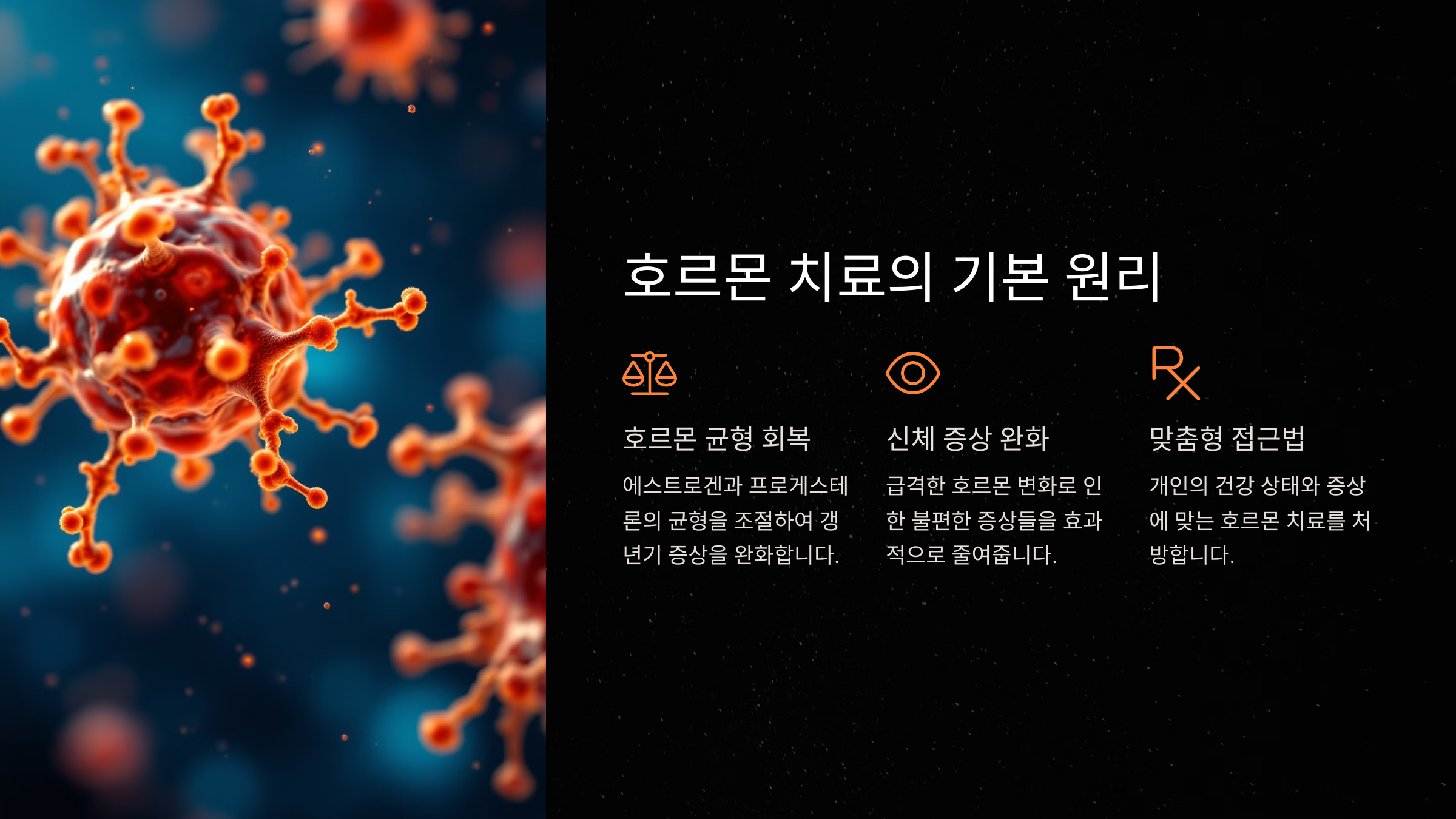 갱년기는 여성의 난소 기능이 서서히 감소하면서 에스트로겐과 프로게스테론 등의 성호르몬 분비가 줄어드는 시기예요. 호르몬 치료는 이 부족해진 호르몬을 외부에서 보충해서 증상을 완화해주는 방식이에요. 대표적인 증상으로는 안면홍조, 발한, 불면, 질 건조감 등이 있고, 이들을 효과적으로 개선할 수 있어요.