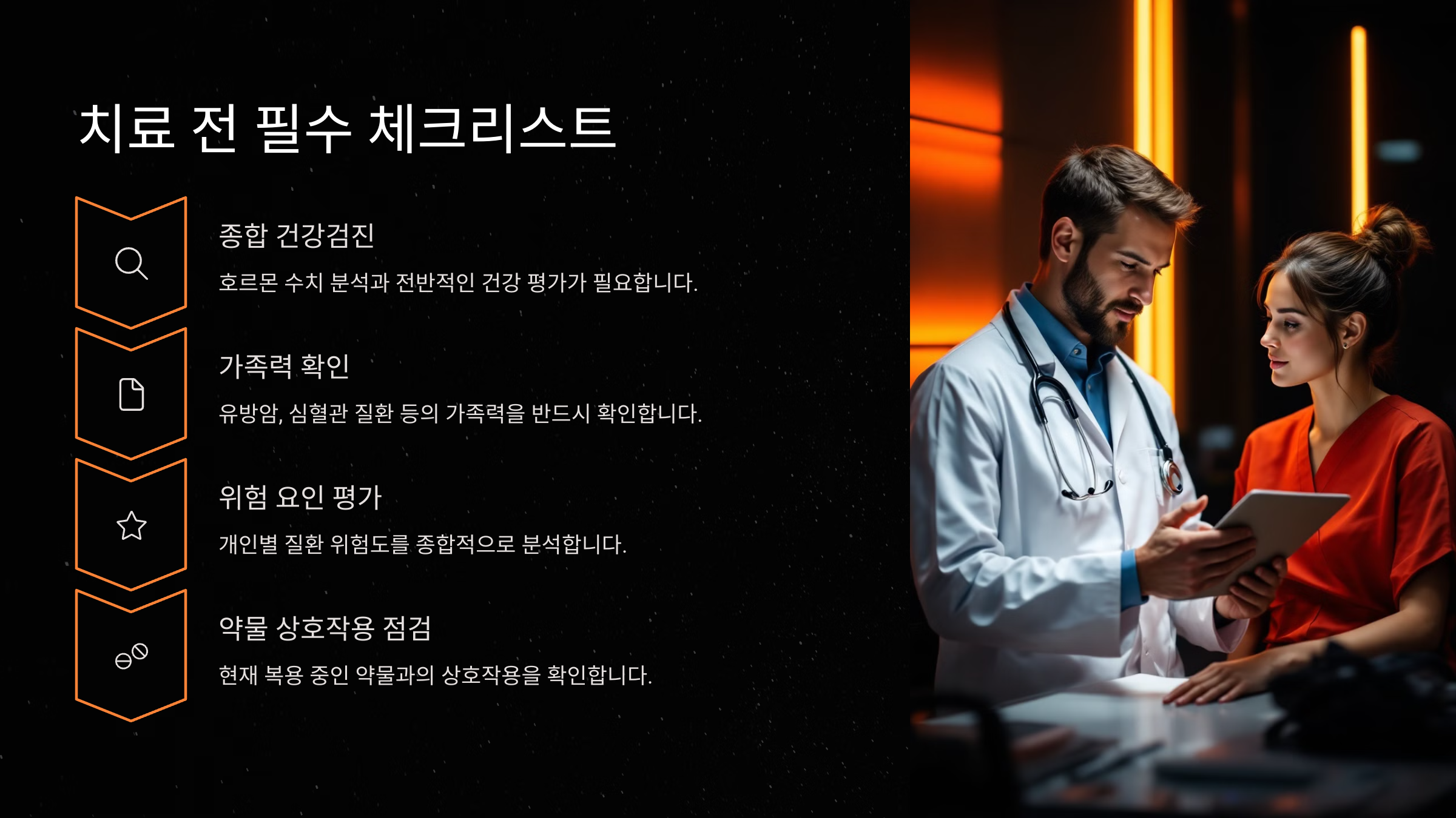 여기까지 호르몬 치료의 기본 원리와 주요 효과에 대해 알아봤어요. 다음 섹션에서는 치료 시작 전 반드시 점검해야 할 체크리스트를 알려드릴게요. 🔍