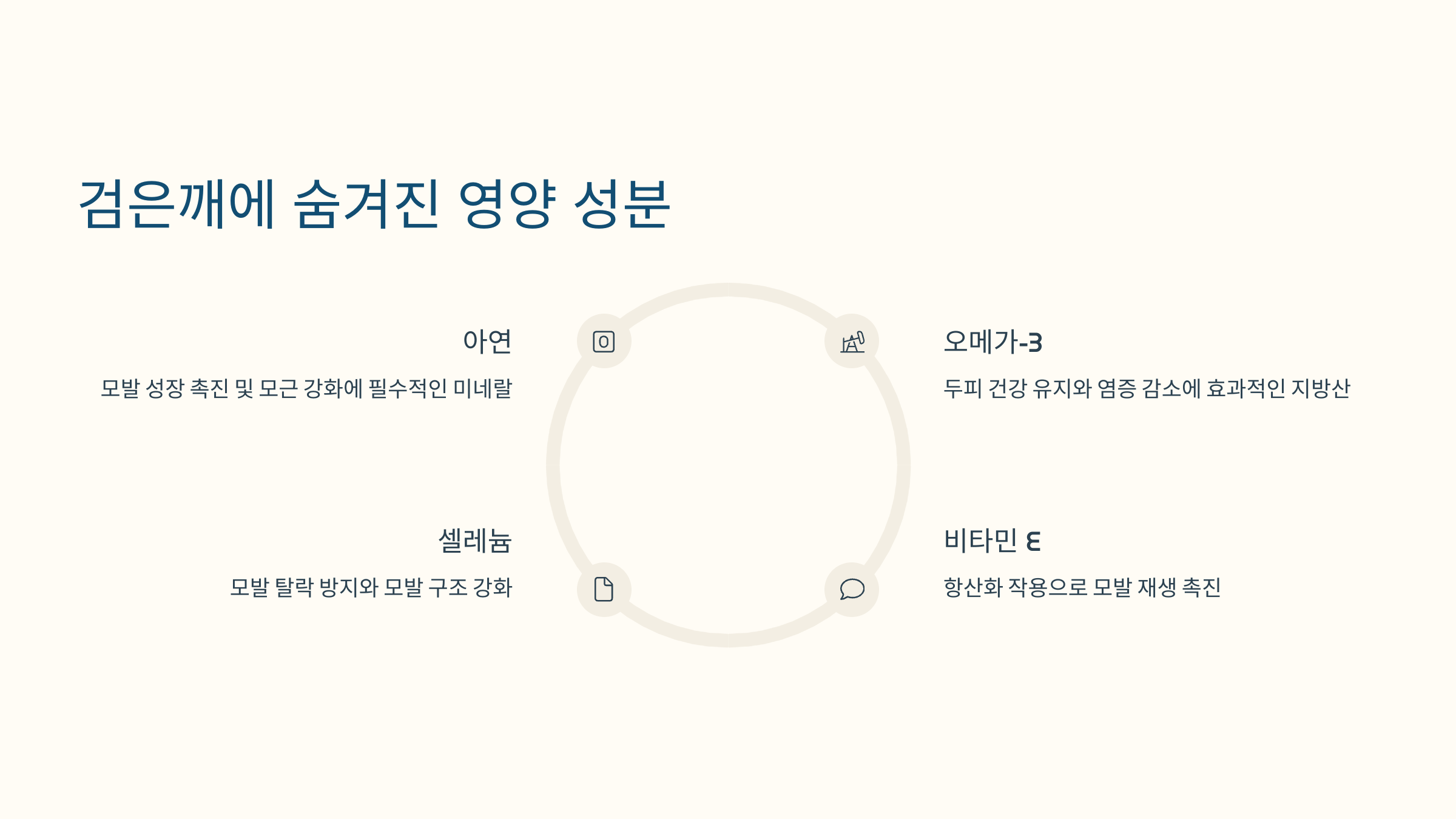 검은깨에는 단백질, 불포화지방산, 비타민 B군, 비타민 E, 철분, 아연, 셀레늄 같은 미네랄이 골고루 들어 있어요. 이 중 특히 단백질은 모발의 주요 성분인 케라틴을 구성하는 데 꼭 필요한 성분이라, 머리카락을 튼튼하게 유지하는 데 핵심이에요.