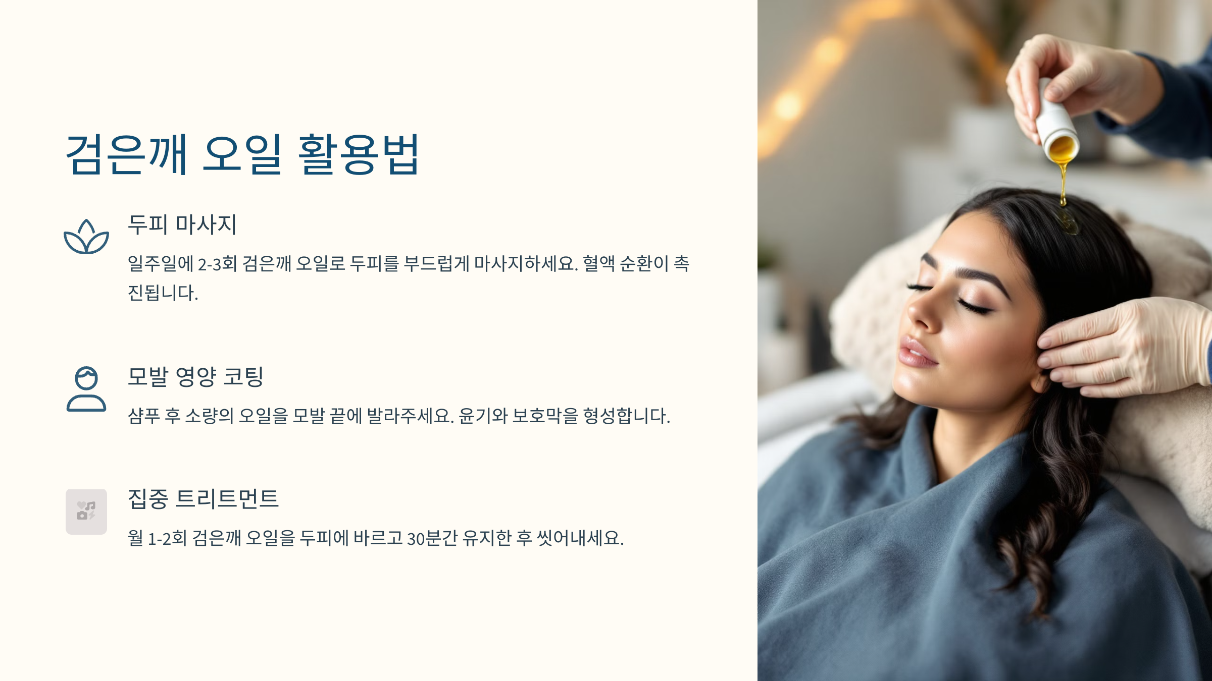 두피가 민감하거나 건조한 분들에게는 검은깨 오일 마사지가 특히 좋아요. 오일 성분이 각질을 부드럽게 제거하고 두피에 촉촉함을 남겨줘서 건강한 모발 성장을 위한 환경을 만들어준답니다. 단, 향이 진하므로 소량부터 테스트해보는 게 좋아요.