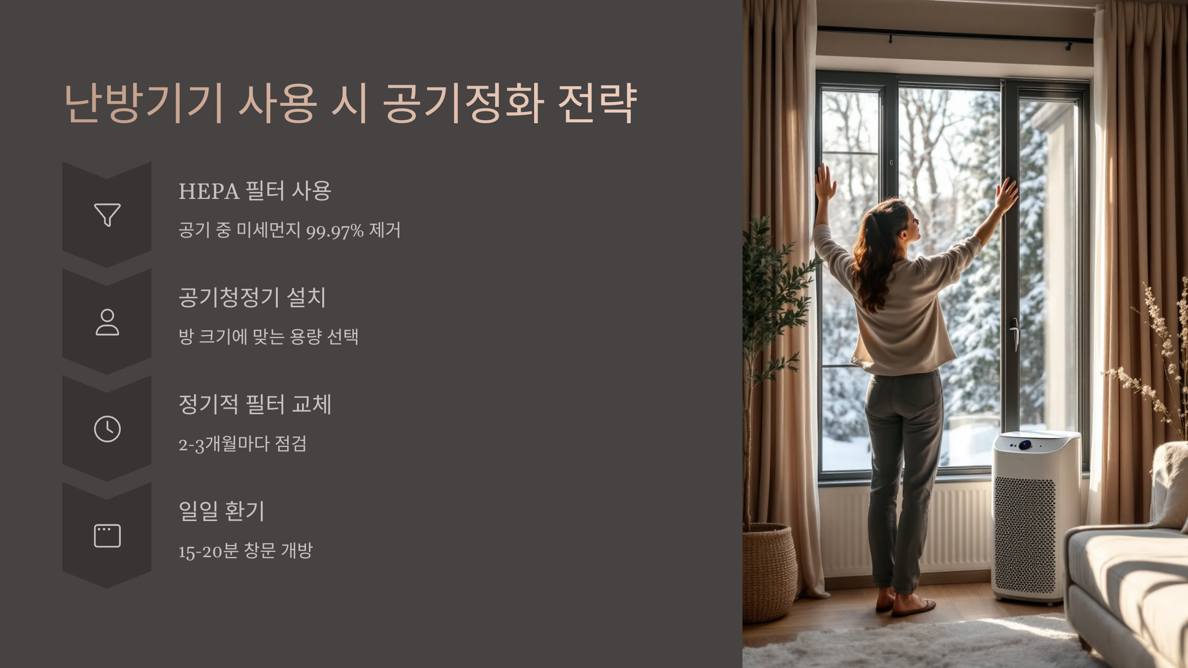 난방기기 사용 시에는 환기와 함께 공기 정화에도 신경 써야 해요. 건조한 공기와 호흡기 건강 문제를 예방하려면 주기적인 환기와 습도 조절이 필수랍니다. 제가 생각했을 때는, 겨울철 건강관리의 핵심은 ‘따뜻하지만 맑은 공기’를 유지하는 것 같아요.