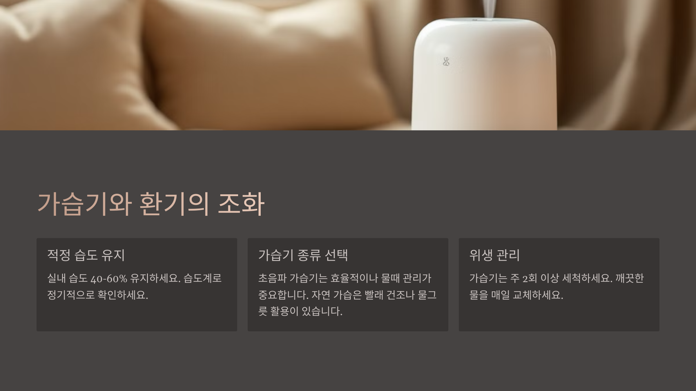 | 가습기 | 습도 조절 | 탁자 위 or 가전기기 근처 피하기 |