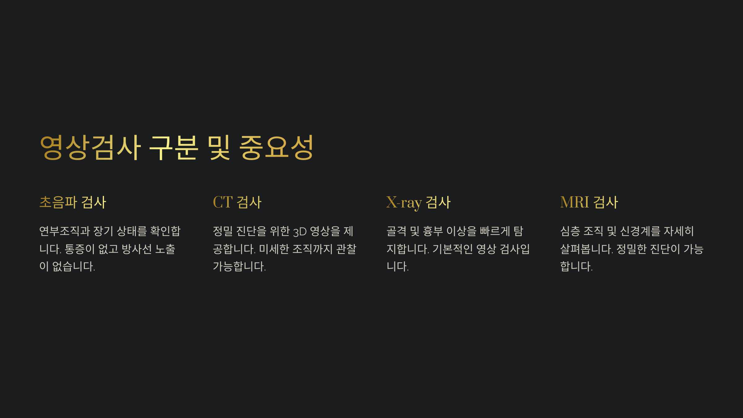| MRI | 자세하고 정밀, 고가 | 뇌, 척추, 관절, 연부조직 | ❌ 없음 |