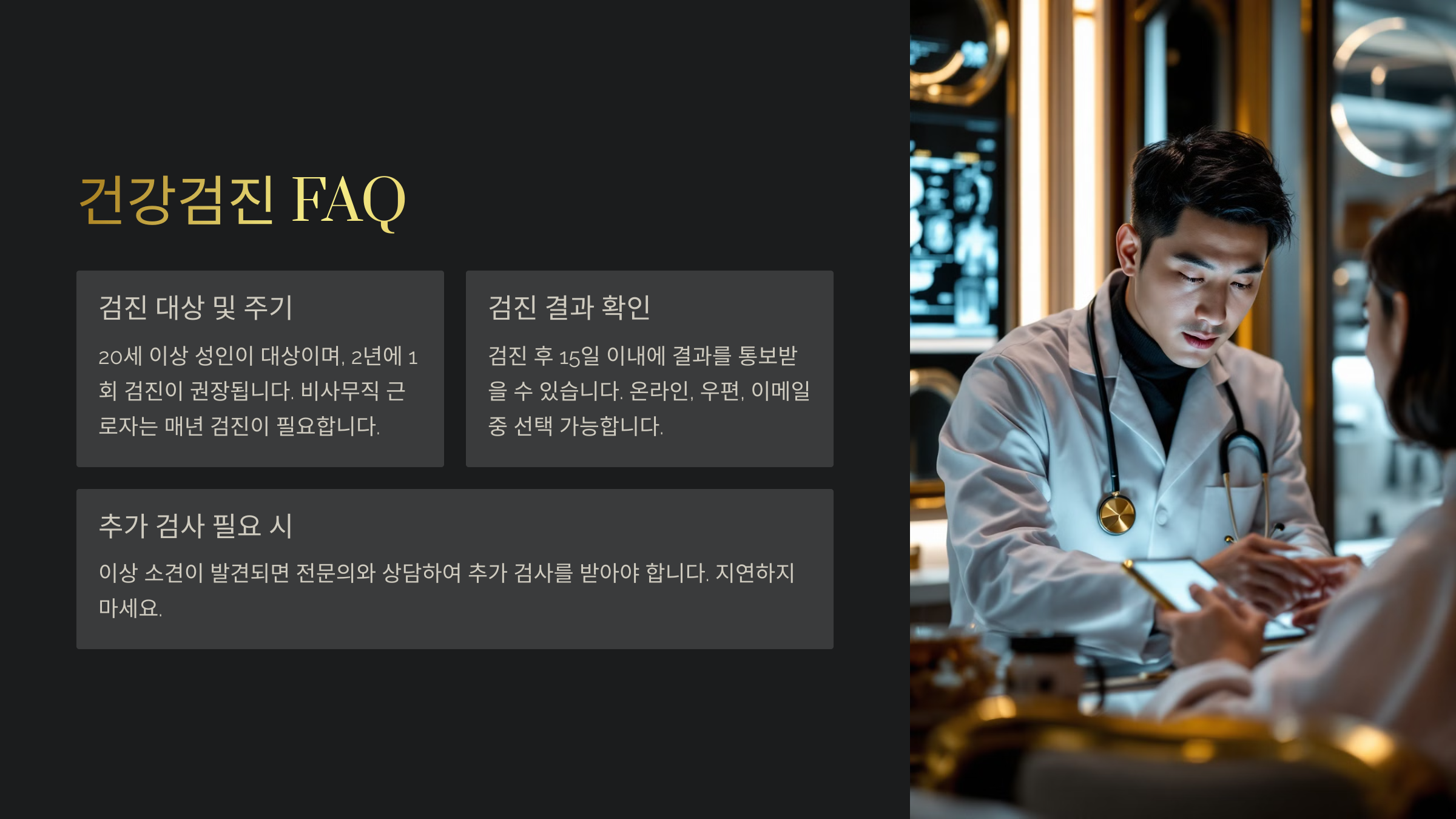 한 항목의 누락이 내 몸의 건강지도에 큰 구멍을 만들 수 있어요. 한 번 받을 때 꼼꼼히 체크하고 필요한 검사는 절대 빠뜨리지 말기! 마지막으로 건강검진에 대해 사람들이 자주 묻는 질문들을 FAQ로 정리해볼게요. 🙋