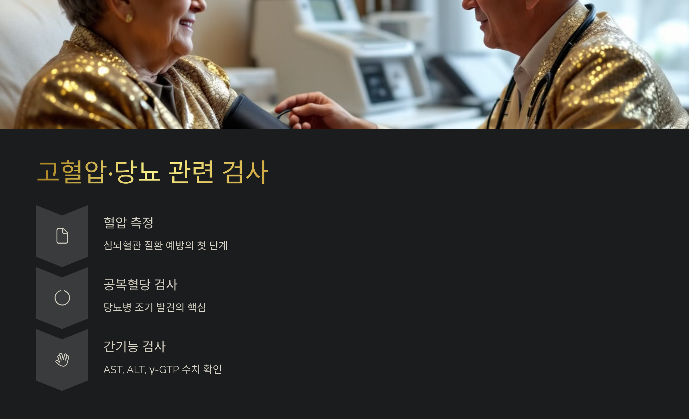 이 두 질환이 무서운 이유는 합병증이에요. 고혈압은 뇌출혈, 심부전, 신장 손상으로 이어질 수 있고, 당뇨는 시력저하, 신장병, 말초신경장애, 심혈관질환을 유발할 수 있어요. 그래서 단순 혈압·혈당 검사 외에도 심전도, 신장기능, 눈안저검사, 단백뇨 검사 등을 함께 하는 것이 좋아요.