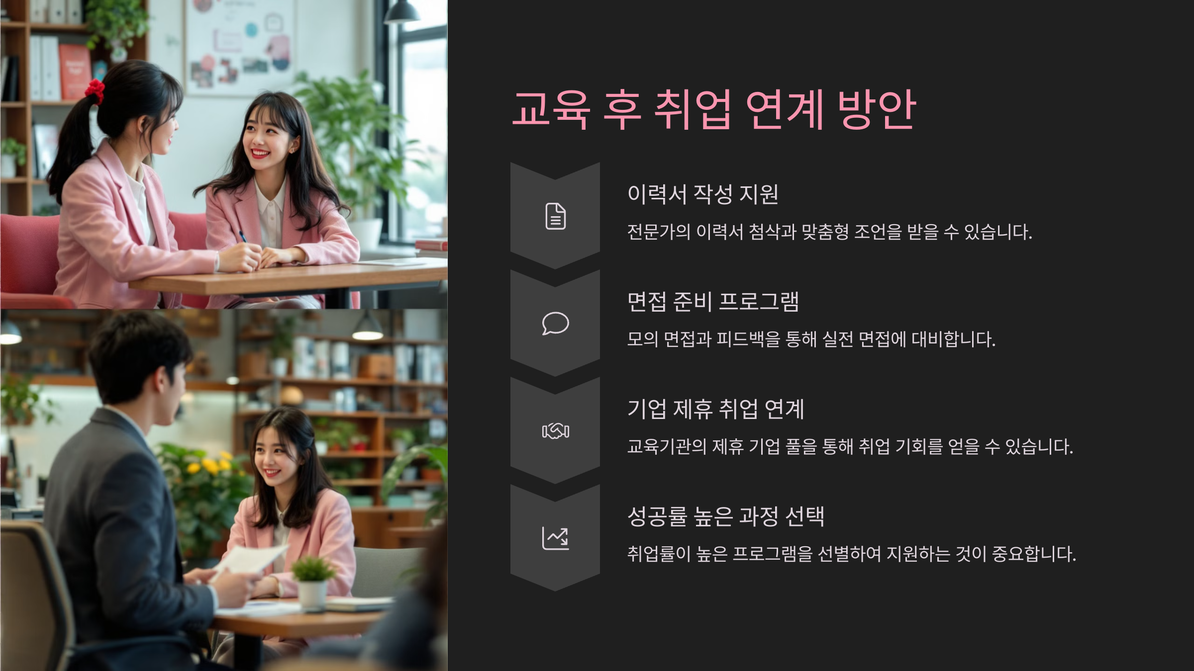 또한 훈련과정을 마친 후에도 고용센터의 구직지원 프로그램과 연계되기 때문에 실질적인 채용 정보 제공과 추천을 받을 수 있어요. 특히 ‘국민취업지원제도’와 함께 이용하면 시너지가 커지죠.