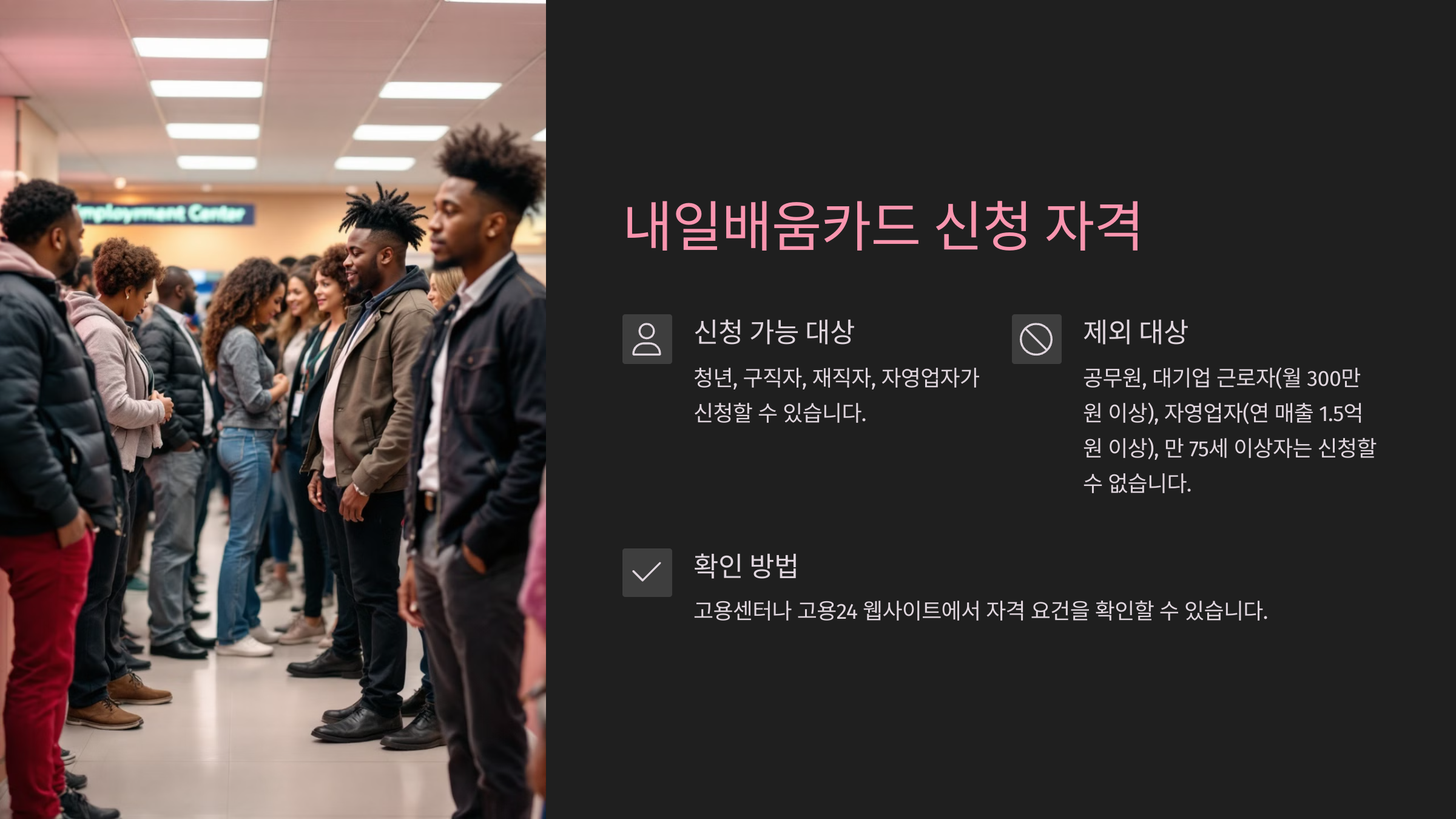 자격요건은 근로시간, 소득 수준, 실직 여부에 따라 달라지는데요. 예를 들어, 자영업자의 경우 연매출이 일정 기준 이하이고, 고용보험 미가입 상태여야 하며, 재직자의 경우 일정 소득 이하의 중소기업 근로자여야 해요. 신청 전에 꼭 체크해야 하는 부분이에요.