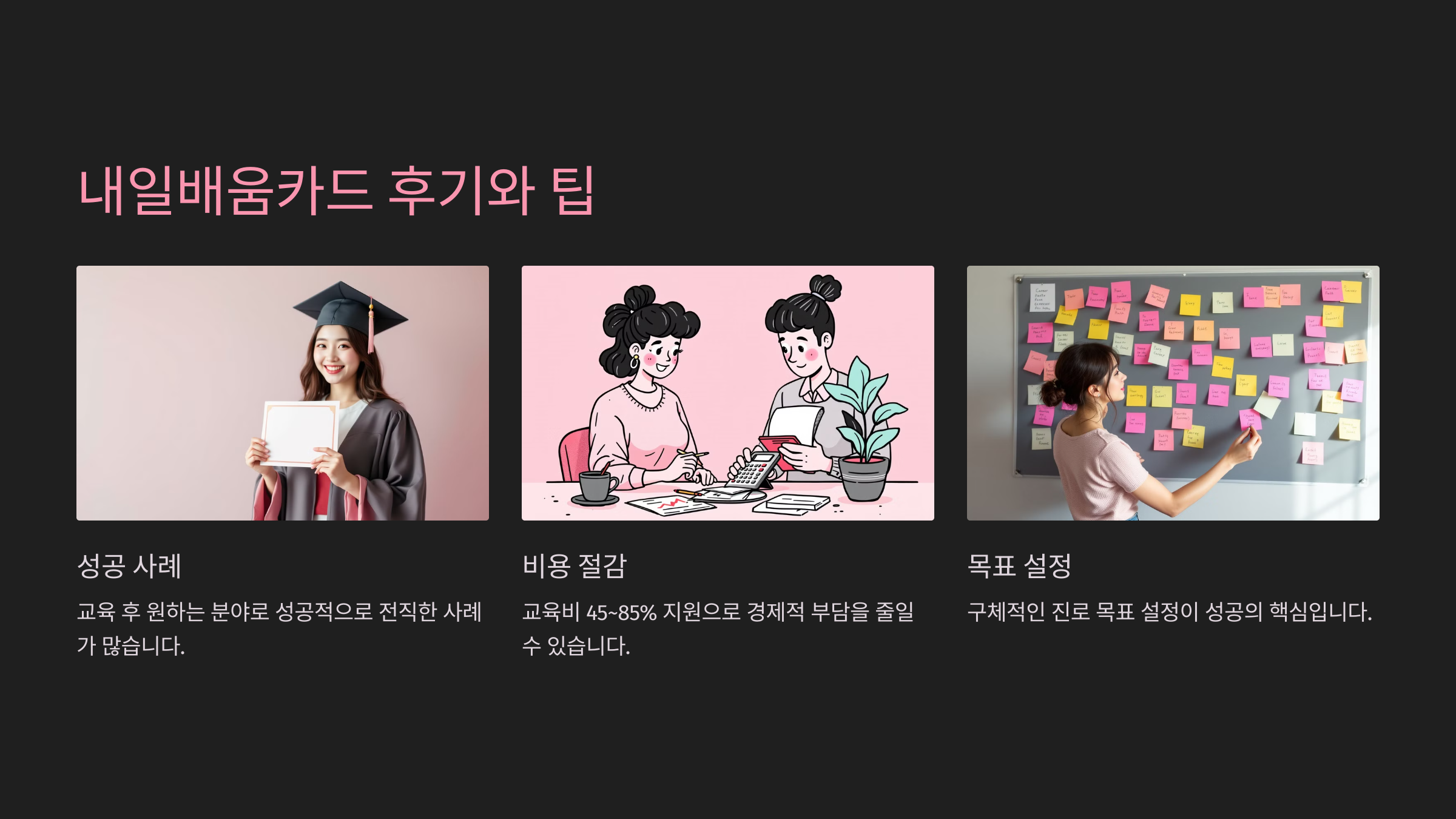 제가 생각했을 때, 내일배움카드의 진짜 가치는 "내가 몰랐던 분야의 새로운 가능성"을 찾을 수 있다는 점이에요. 단순히 기존에 하던 일을 연장하는 게 아니라, 완전히 새로운 분야로의 전환도 가능하다는 건 정말 큰 기회라고 느껴요.