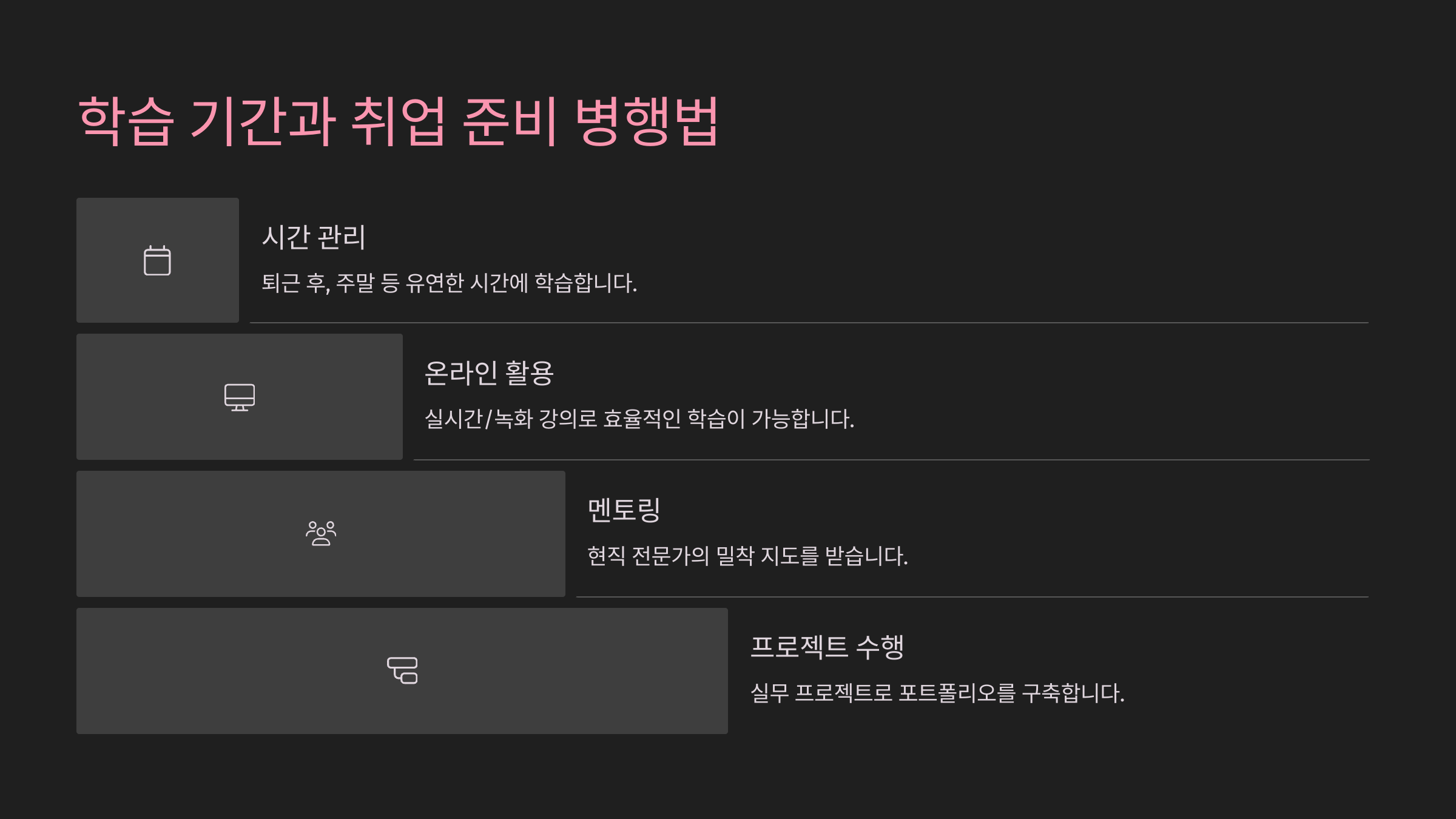 | 소통 | 실시간 강사 피드백 | 게시판·채팅 활용 |