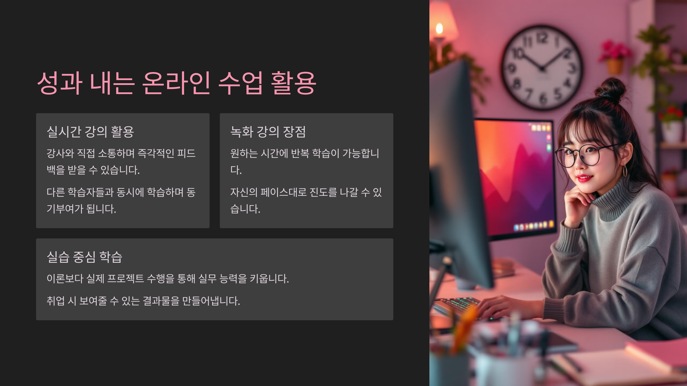 한편 온라인 강의는 자율성이 높기 때문에 자기 관리가 중요해요. 매일 일정 시간 학습 계획을 정해두고, 실전처럼 수업에 참여하면 학원 못지않은 결과를 낼 수 있어요.