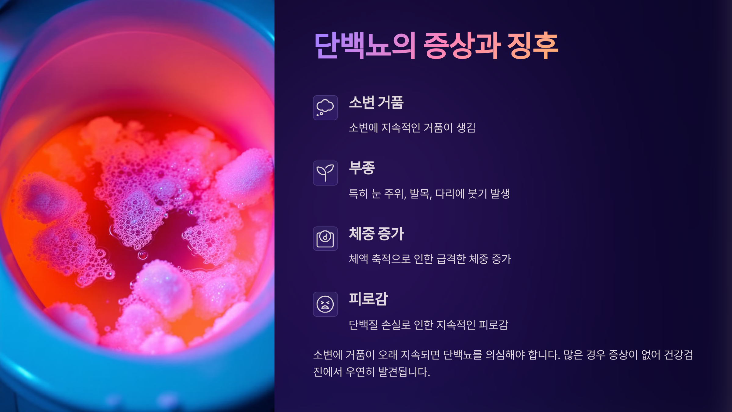 단백뇨는 조용히 찾아오는 증상이에요. 대부분의 경우 뚜렷한 이상 신호 없이 진행되기 때문에, 몸에서 보내는 미세한 신호를 잘 캐치하는 게 중요해요. 특히 눈에 보이는 증상이 없다고 안심하면 안 돼요.