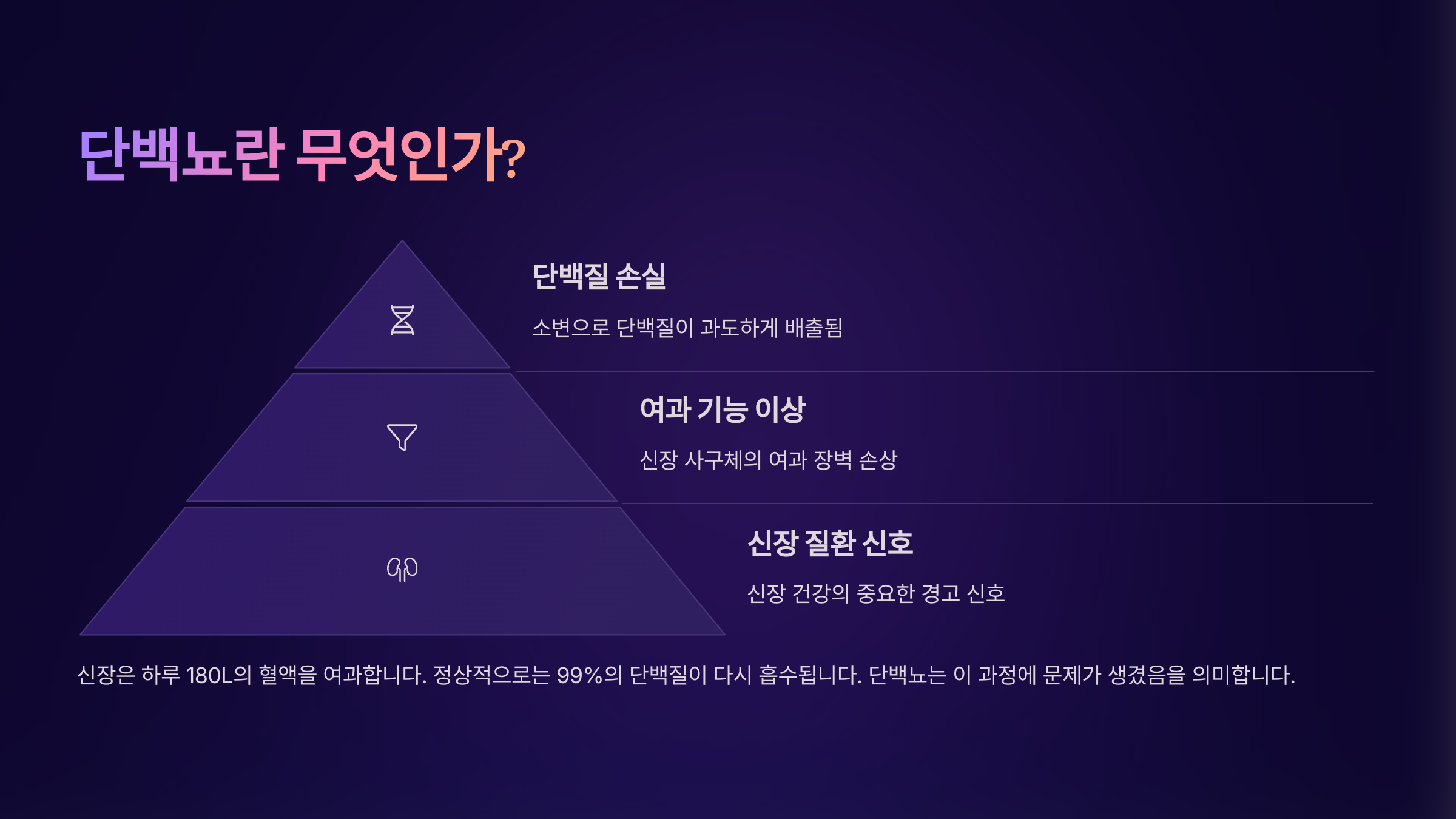 단백뇨는 우리 몸의 필터 역할을 하는 신장이 이상 신호를 보내는 아주 중요한 징후예요. 소변에서 단백질이 검출되는 이 현상은, 평소에 신장이 제 역할을 못할 때 주로 나타나죠. 흔히 피곤해서 일시적으로 나타날 수도 있지만, 방치하면 만성 신장질환까지 이어질 수 있답니다.