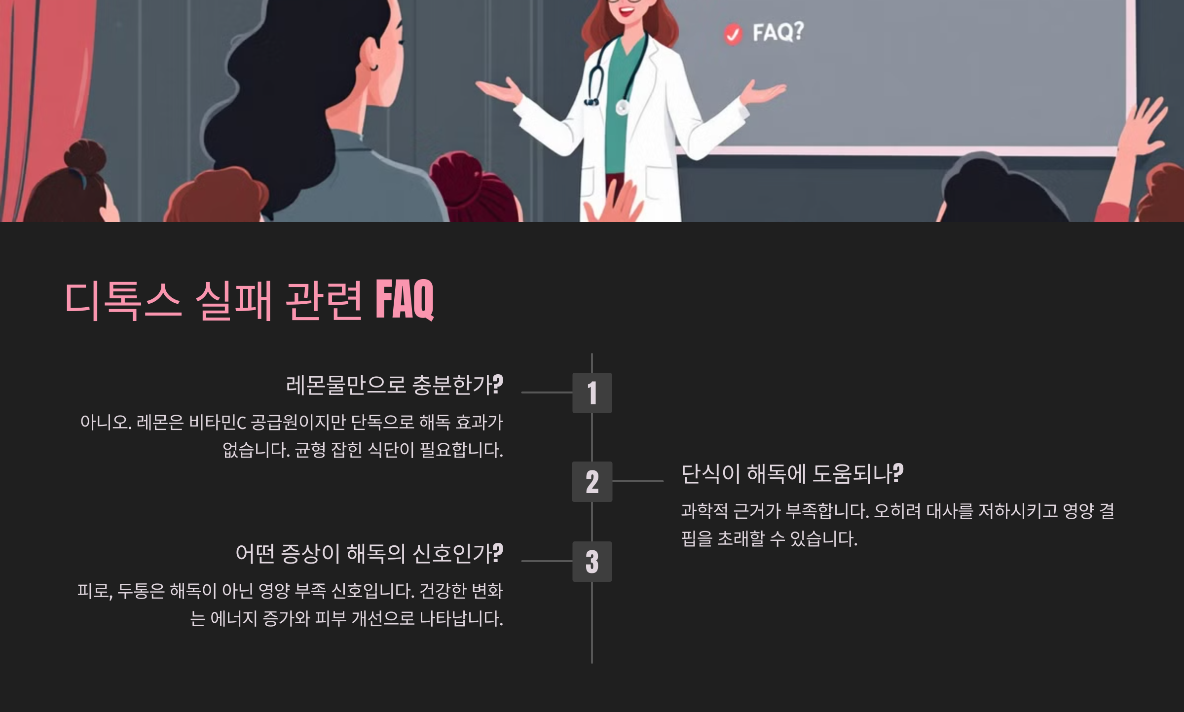이제 마지막 섹션인 FAQ로 넘어가요! 많은 사람들이 레몬 디톡스를 하며 궁금해했던 질문들을 정리해뒀어요. 바로 이어서 확인해볼까요? ❓❗