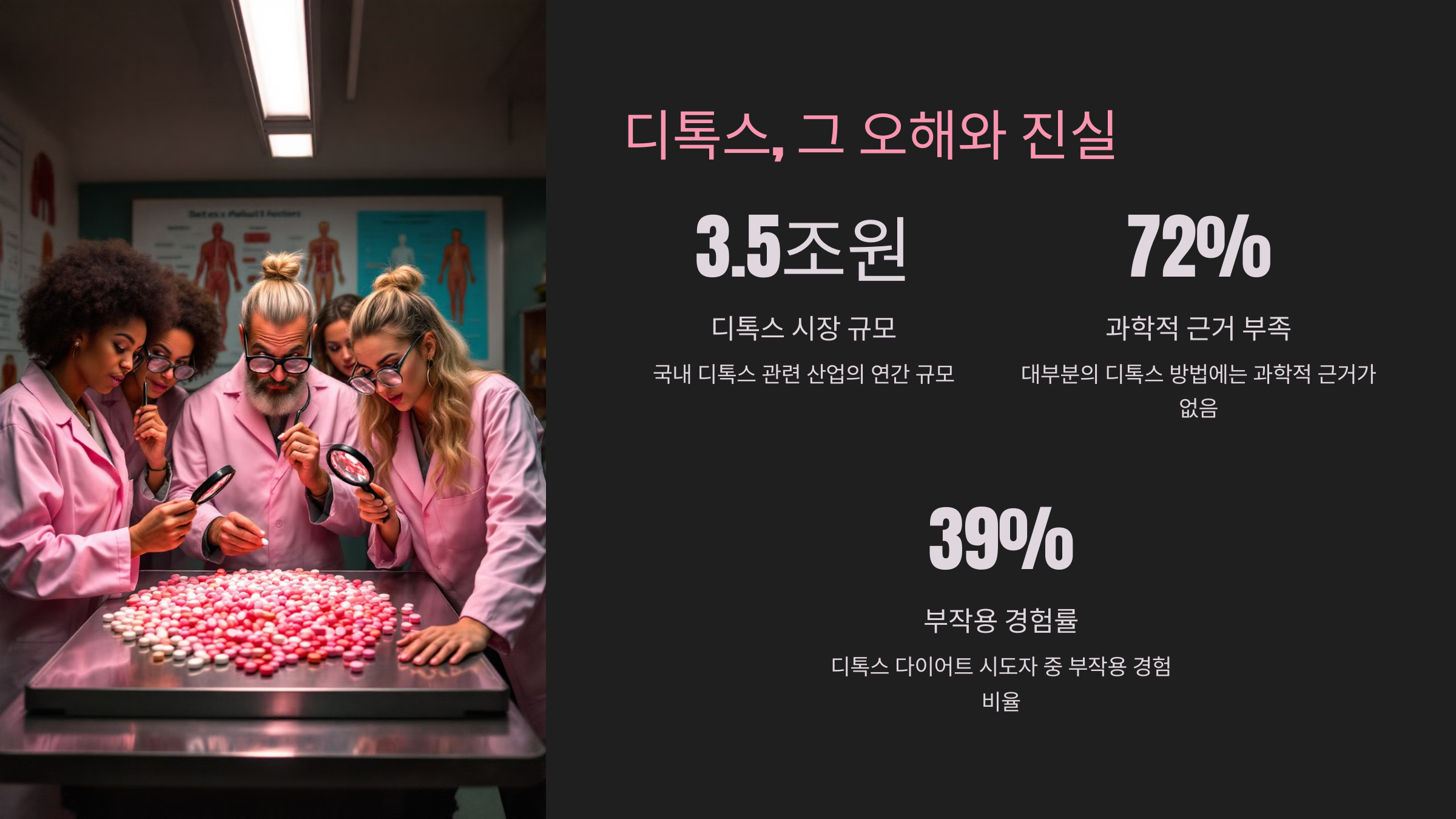 기대와 달리 실제 디톡스는 굉장히 섬세하고 복합적인 과정을 요구해요. 몸은 단순히 ‘뺄셈’만으로 건강해지지 않아요. 체내 노폐물은 간단한 물 한 잔으로 씻겨나가지 않죠. 특히 지방 속에 쌓인 독소는 꾸준한 관리 없이는 빠지지 않아요.