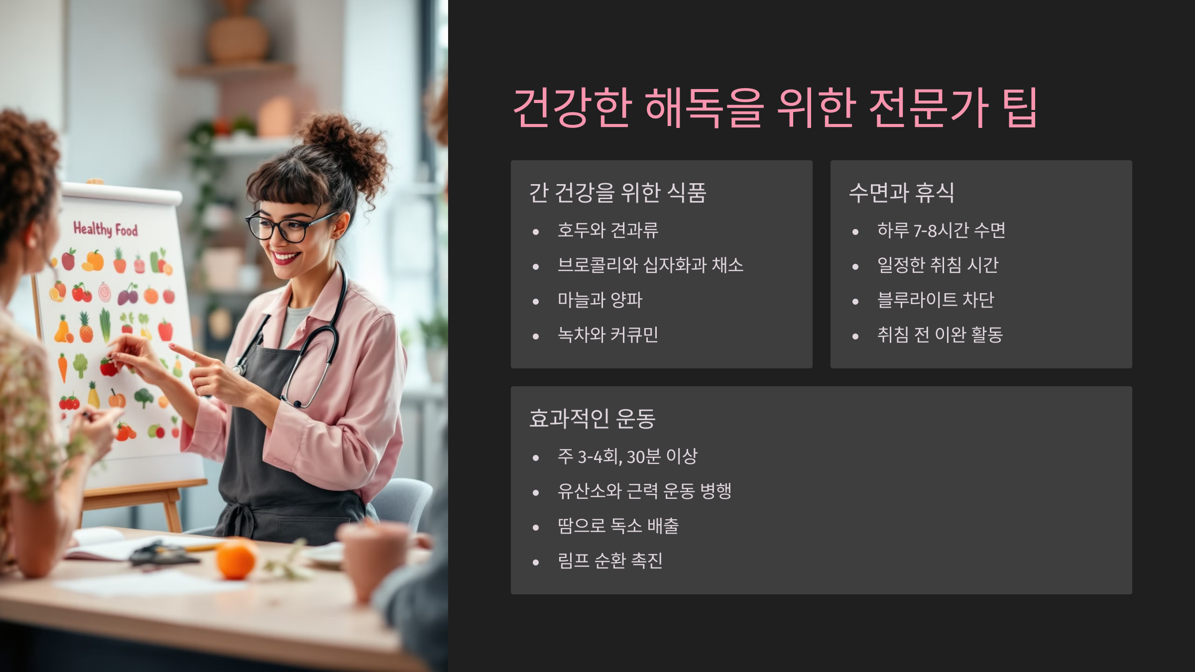 마지막으로, 디톡스를 일회성 이벤트처럼 생각하는 것도 실수예요. 진짜 해독은 며칠의 노력이 아니라, 평소의 식단, 수면, 스트레스 관리가 모두 모여야 이루어지는 거예요. 그래서 단기적인 디톡스보단 장기적으로 ‘해독에 좋은 습관’을 들이는 게 훨씬 중요하답니다.