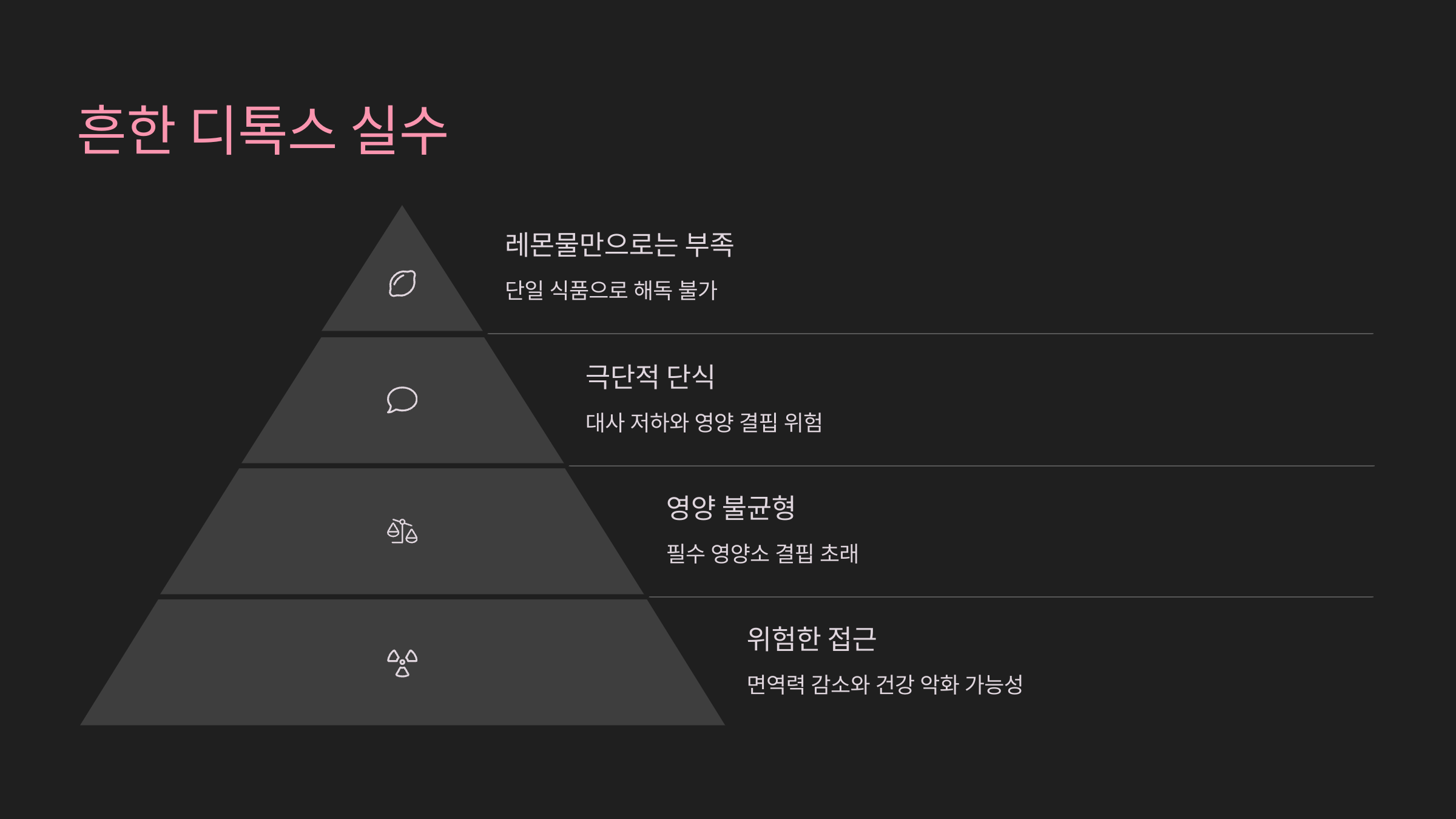 디톡스를 하겠다고 결심한 순간, 우리는 보통 ‘최대한 빠르게 효과를 보겠다’는 생각에 집착하게 돼요. 이때부터 실수가 시작되는 거죠. 가장 흔한 오류 중 하나는 ‘오직 레몬물만 마시기’예요. 하루 종일 아무것도 먹지 않고 레몬물만 마시는 건 단기적으로 체중이 줄어드는 것처럼 보일 수 있지만, 사실 건강을 크게 해치는 방법이에요.