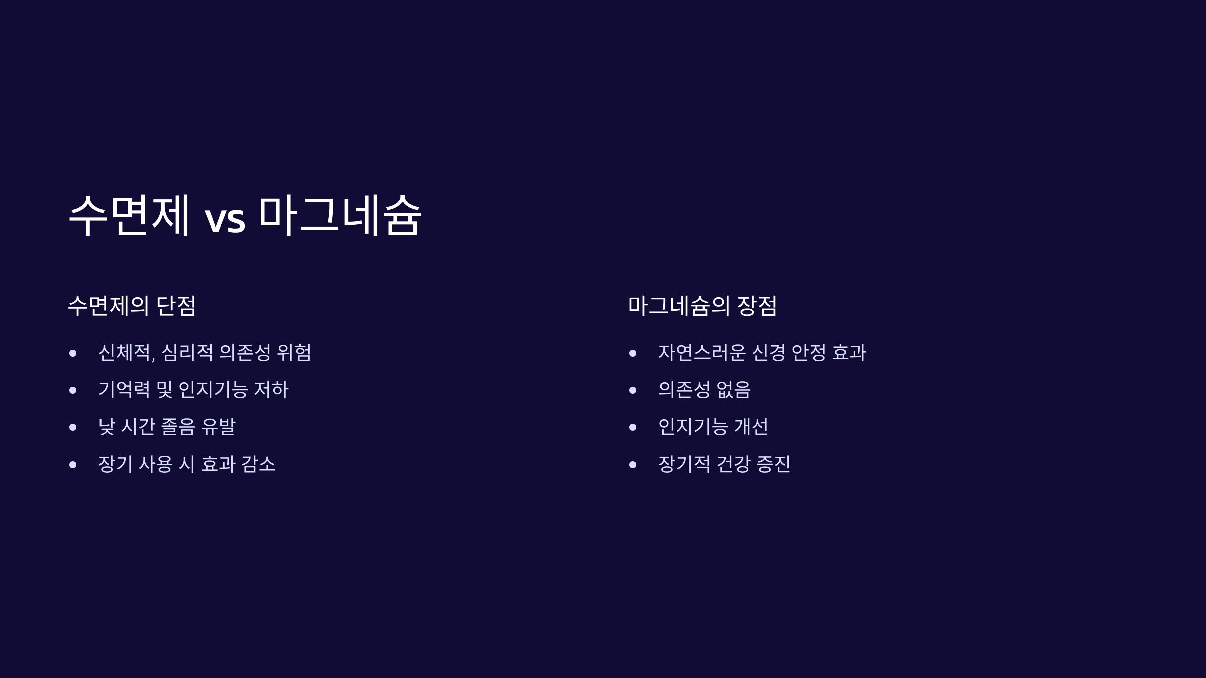 또한 수면제는 깊은 수면보다는 '무의식적 수면' 상태를 만드는 경우가 많아서, 자고 나도 개운하지 않을 수 있어요. 마그네슘은 수면 단계 중 깊은 수면을 자연스럽게 유도해서 실제로 몸이 회복되는 느낌을 더 잘 줄 수 있어요.