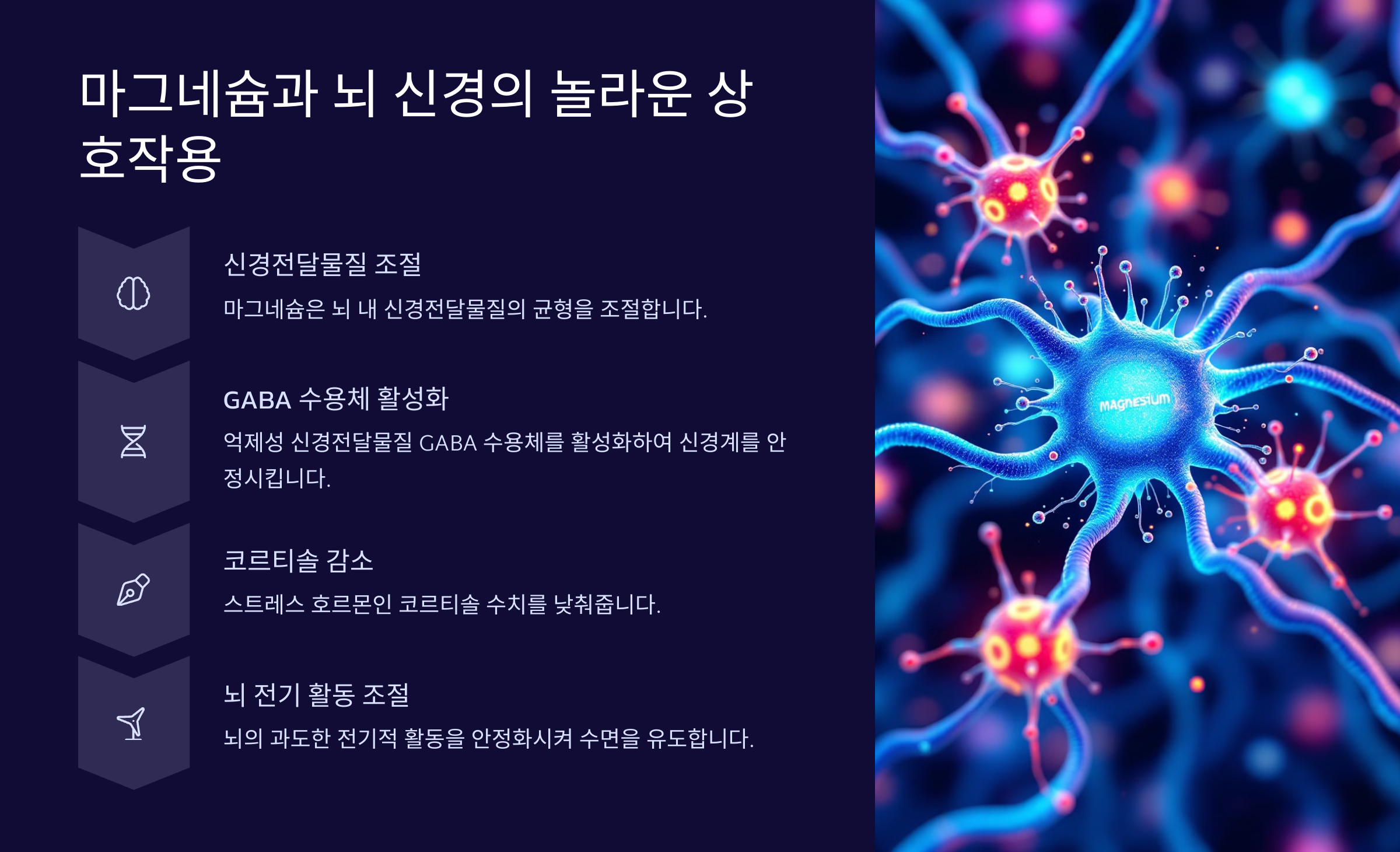마그네슘은 뇌에서 여러 신경전달물질의 균형을 유지하는 데 꼭 필요해요. 가장 핵심적인 건 흥분성 신경전달물질인 글루타메이트의 작용을 제어하는 역할이죠. 이게 무슨 뜻이냐면, 과도하게 활동하는 신경을 진정시켜주는 브레이크 같은 거예요.