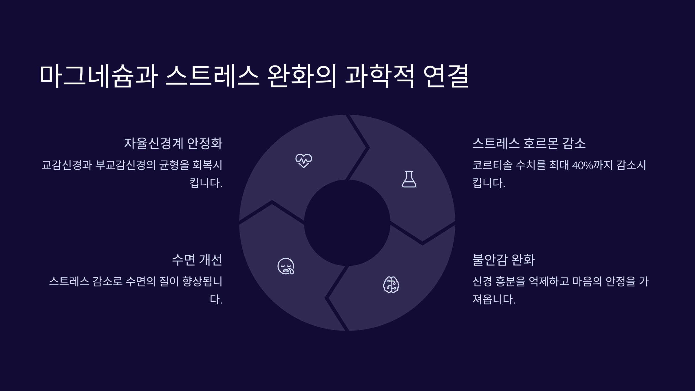 스트레스를 받으면 교감신경이 활발해지면서 심박수와 혈압이 오르고, 뇌는 자극에 민감하게 반응해요. 이때 마그네슘이 부족하면 자율신경계가 균형을 잃고 계속해서 긴장 상태가 유지되기 쉬워요. 이게 결국 수면에도 영향을 주는 악순환이에요.