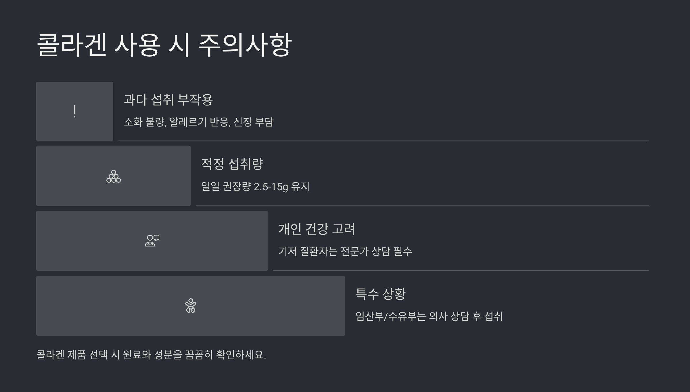 또한 약물을 복용 중이라면 콜라겐과 상호작용이 있을 수 있으니, 전문가와 상담하는 게 안전해요. 일부 항혈전제나 항염증제와 함께 복용 시 부작용 가능성이 보고된 바도 있어요. 건강식품이라도 신중히 접근해야 해요.