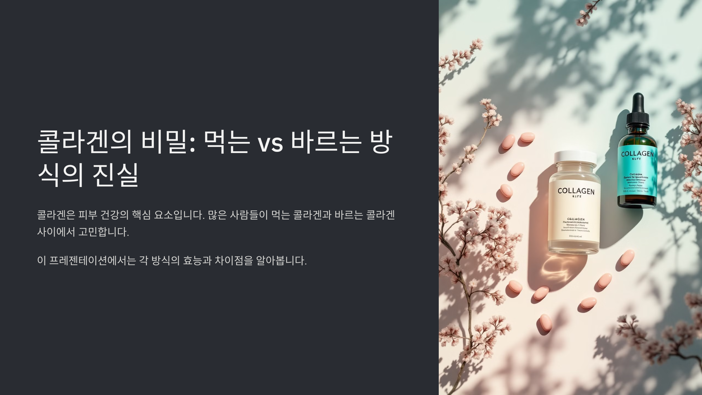 결론적으로, 먹는 콜라겐은 내부에서부터 차근차근 채워주고, 바르는 콜라겐은 외부에서부터 보호하고 보완해주는 역할이에요. 두 가지를 함께 사용하는 것이 가장 균형 있는 피부 케어 전략이라고 할 수 있어요. 💖