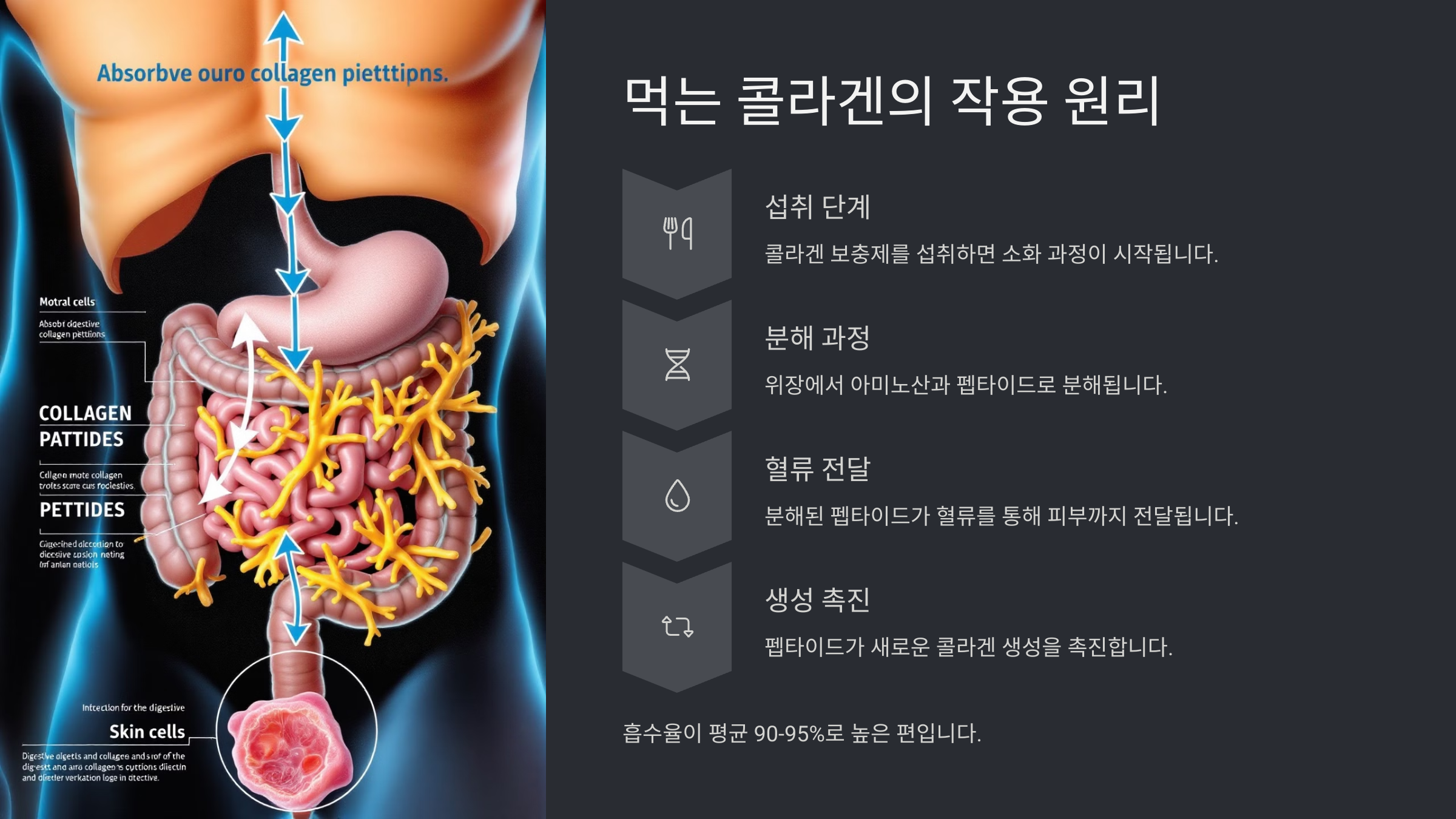 먹는 콜라겐은 보통 펩타이드 형태로 제공돼요. 콜라겐을 그냥 단백질 덩어리로 먹는 게 아니라, 소화 효소에 의해 잘게 분해된 펩타이드나 아미노산으로 만들어져야 몸에 흡수가 잘 돼요. 이 펩타이드가 체내에 들어가면 피부, 관절, 혈관 등 여러 조직에 영향을 줄 수 있답니다.
