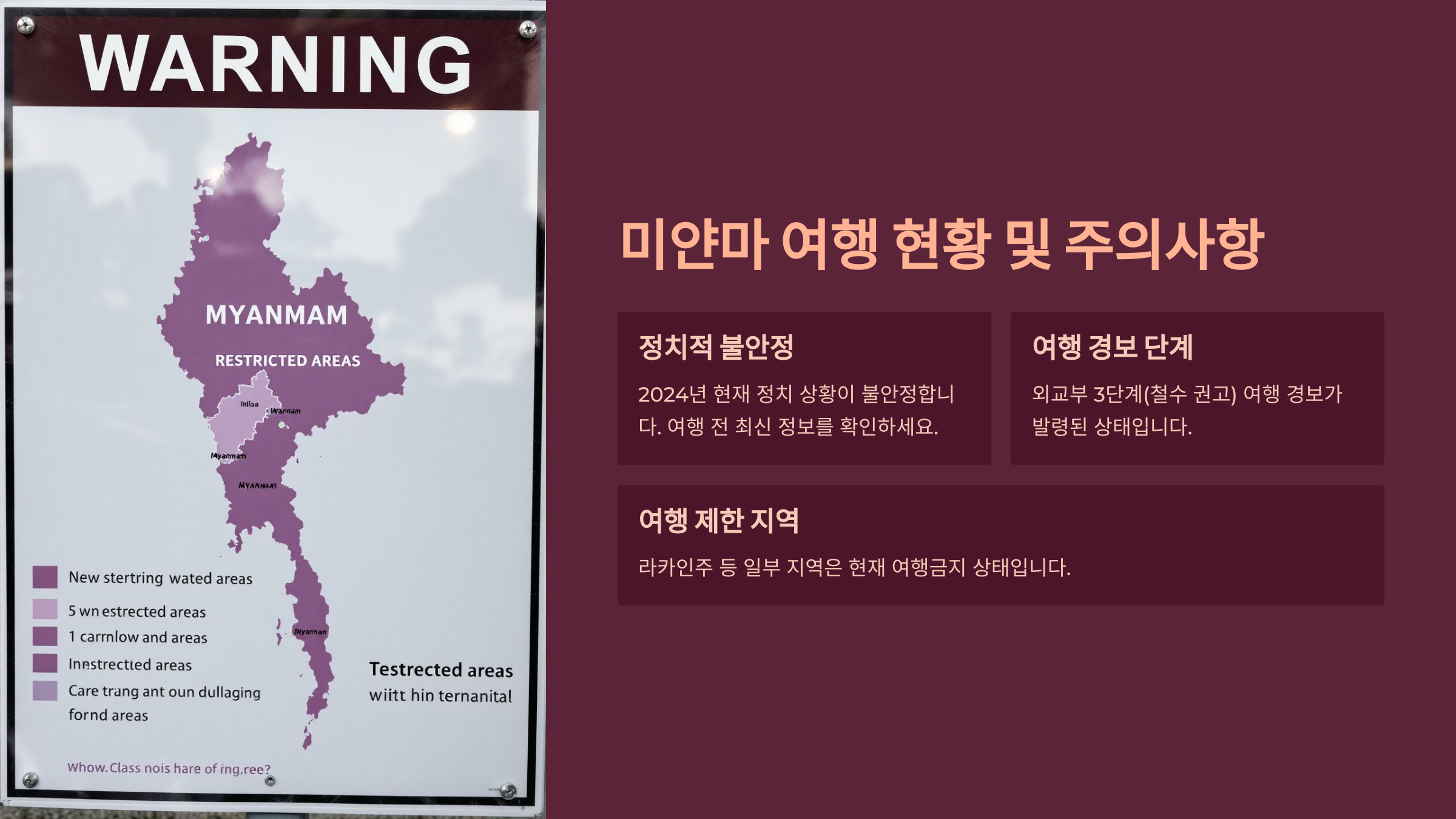 미얀마는 대부분의 지역에서 평화롭고 조용한 분위기를 유지하고 있지만, 일부 지역은 정치적 상황이나 소규모 충돌로 인해 주의가 필요해요. 외교부에서 제공하는 여행경보 시스템을 꼭 확인하고, 여행자 출입이 제한된 지역은 피하는 게 좋아요.