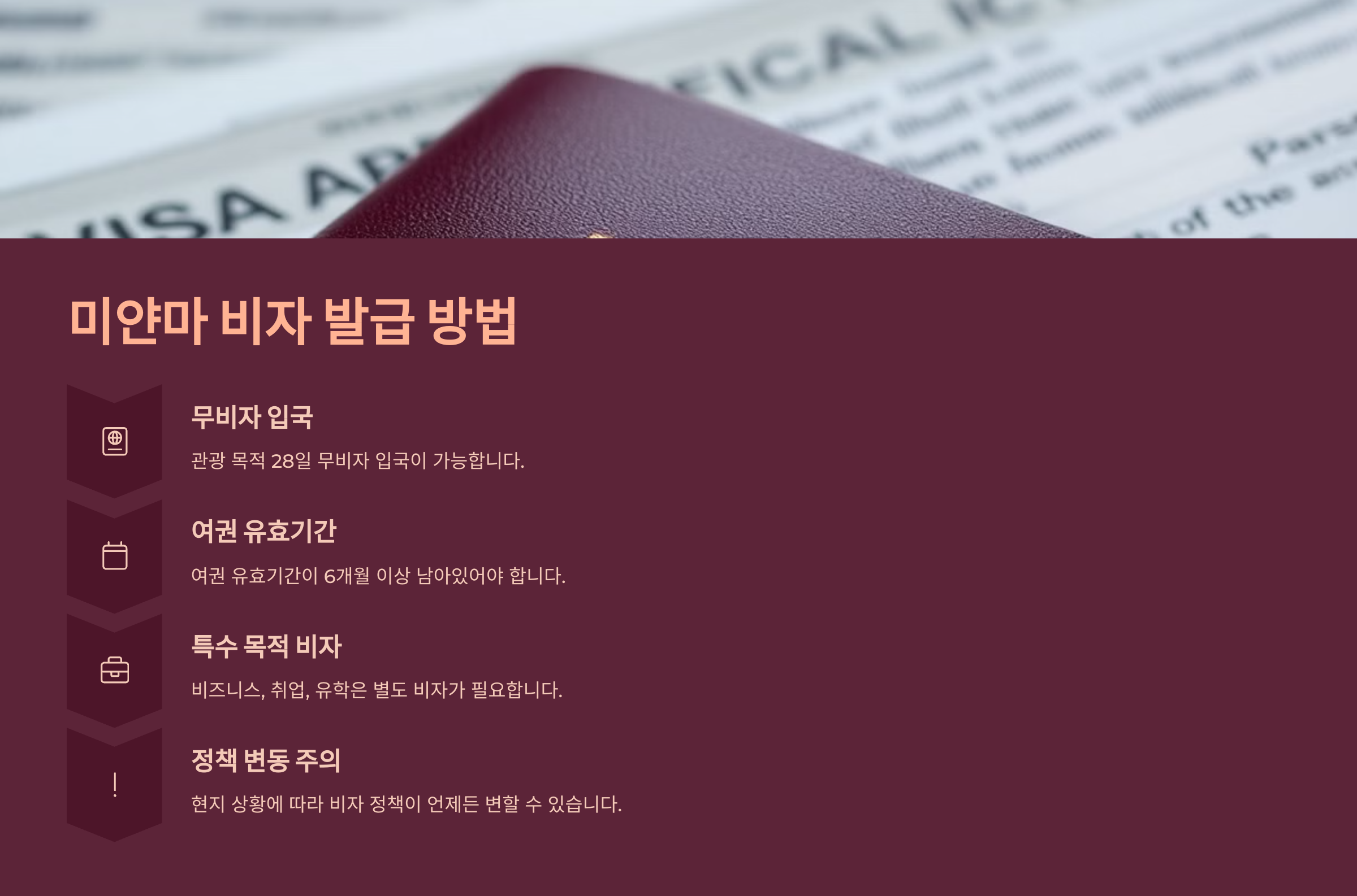 미얀마는 비자 관련 규정이 가끔 바뀌기 때문에 출발 전 다시 한 번 공식 사이트를 체크하는 게 좋아요. 여행 준비는 꼼꼼하게, 그래야 도착해서 더 여유롭고 즐겁게 다닐 수 있어요! 😊