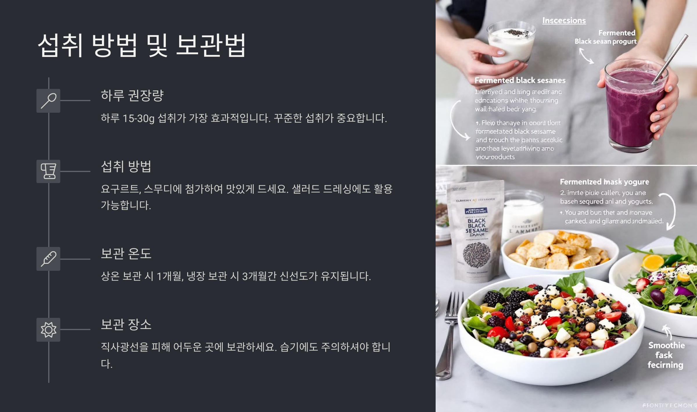 발효 검은깨 제품을 효과적으로 섭취하려면 올바른 방법을 아는 게 중요해요. 아무리 좋은 성분도 내 몸이 받아들이기 좋은 타이밍과 방식으로 섭취하지 않으면 그 효과가 반감될 수 있거든요. 우선 하루 섭취량은 제품에 따라 다르지만, 보통 성인 기준 1~2회, 1회당 3~5g 정도가 적당해요.