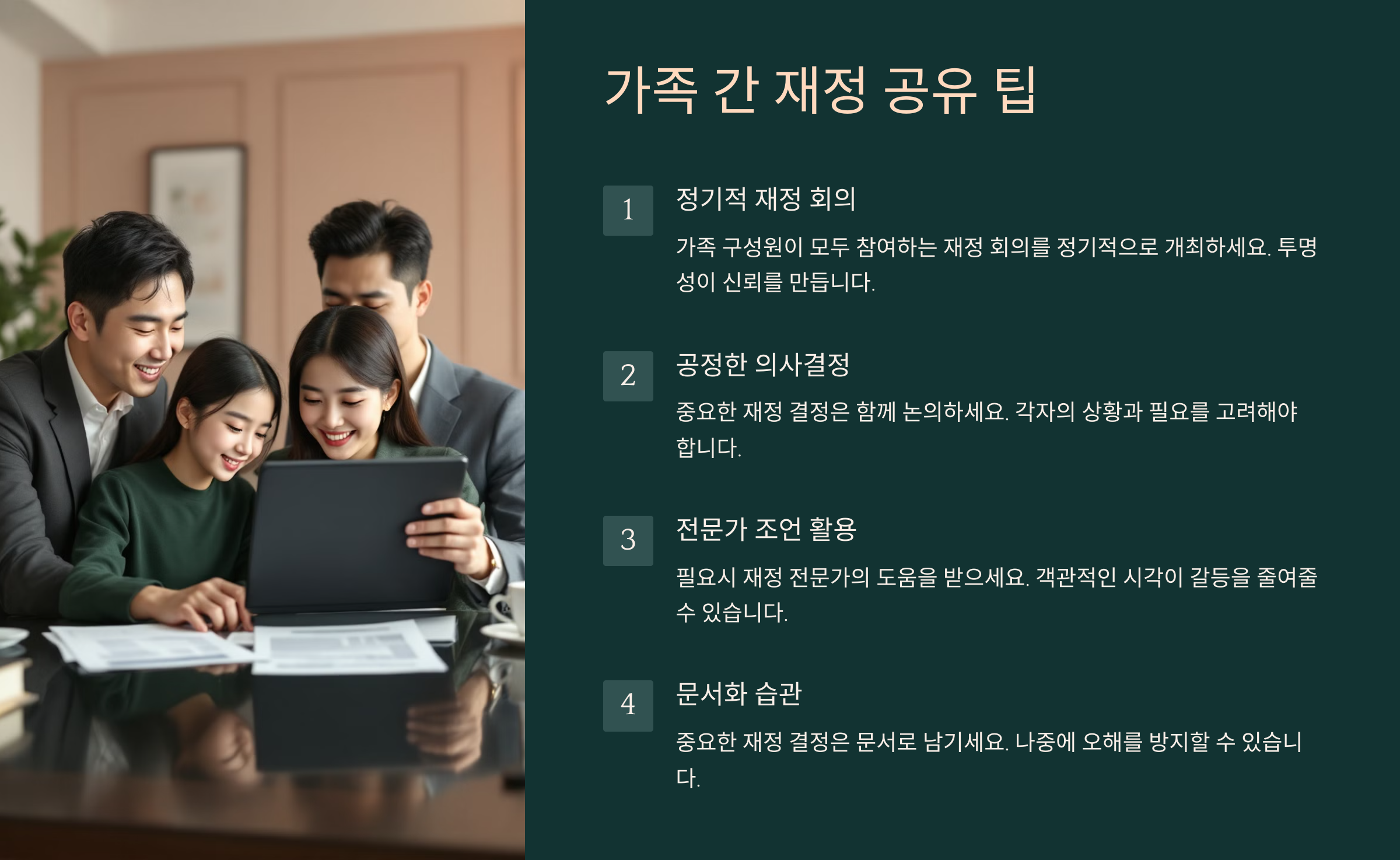 | 부동산 및 연금 정보 공유 | 가족 회의 통해 투명 공개 |