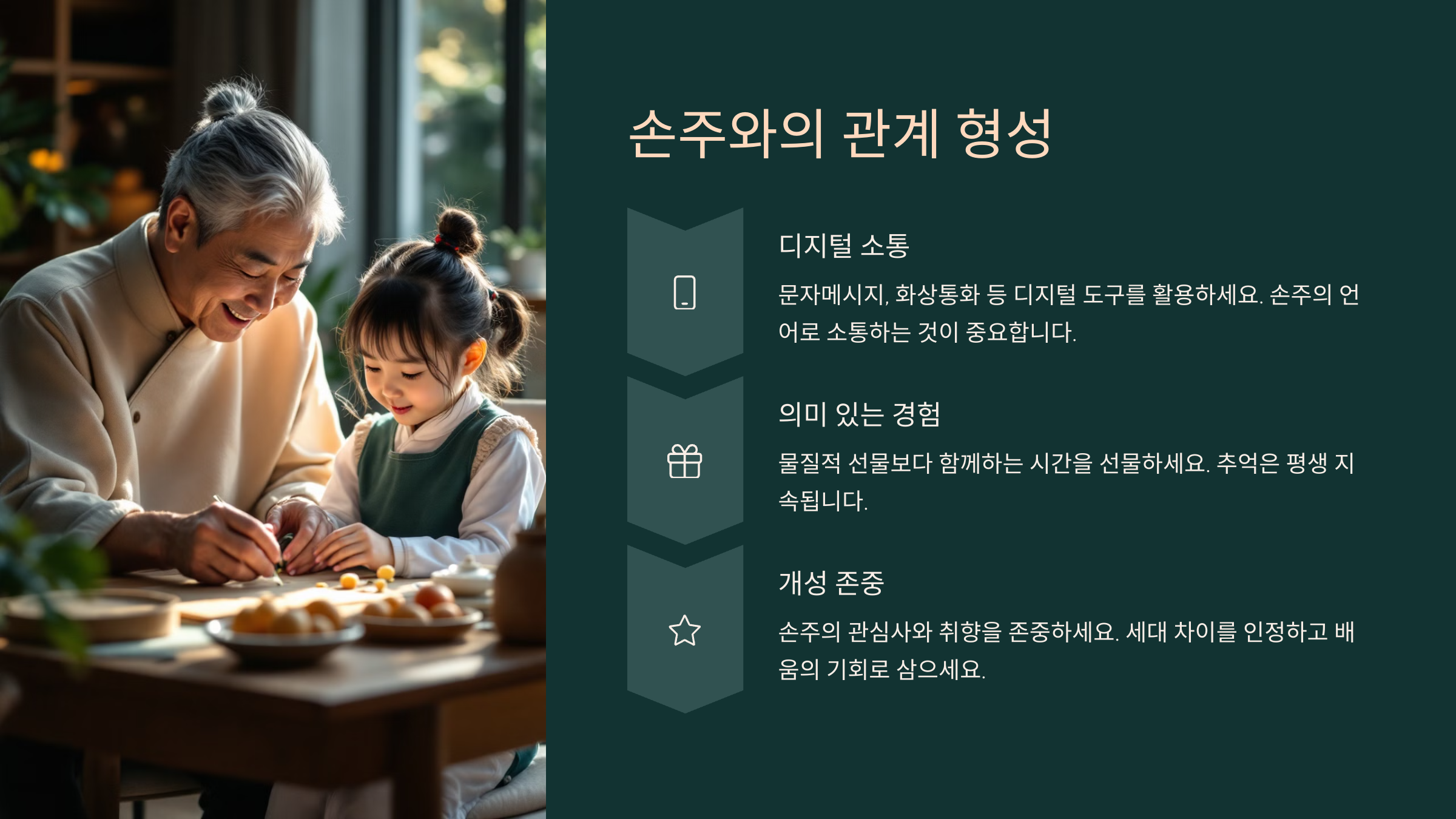 한 가지 팁! 손주에게 ‘비밀 친구’가 되어보세요. 예를 들어, “이건 너랑 나만의 비밀이야~” 하며 둘만의 코드를 만들어보는 거예요. 이런 경험은 아이에게 할머니, 할아버지에 대한 특별한 애정을 만들어줘요.