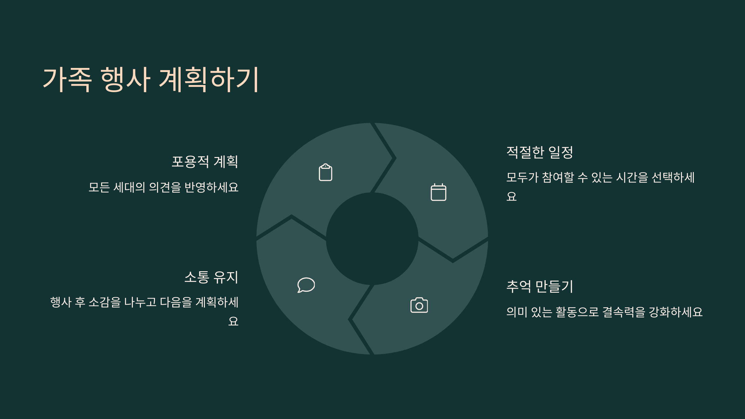 가족 행사는 이벤트보다 ‘정성’이 중요해요. 크고 화려하진 않더라도 가족끼리 웃고, 대화하고, 함께 밥을 먹는 시간만으로도 충분해요. 그 속에서 자연스럽게 가족 간의 거리도 좁혀지고, 정이 쌓여요.