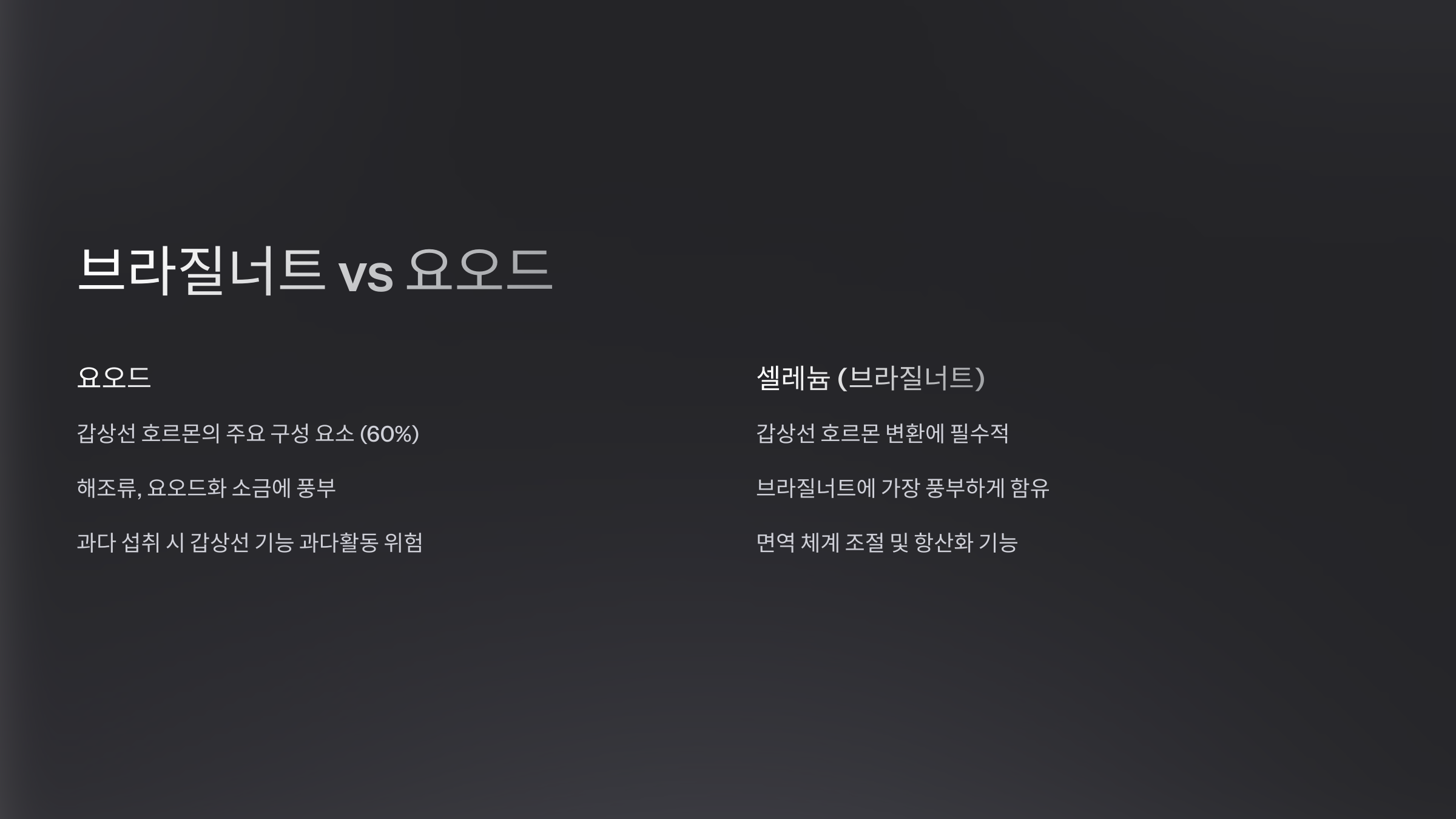 그렇다면 요오드와 셀레늄 중 뭐가 더 중요할까요? 정답은 “둘 다 적정량 필요하다”예요. 한쪽만 강조하면 오히려 갑상선을 해칠 수 있어요. ‘균형’이 핵심이랍니다.