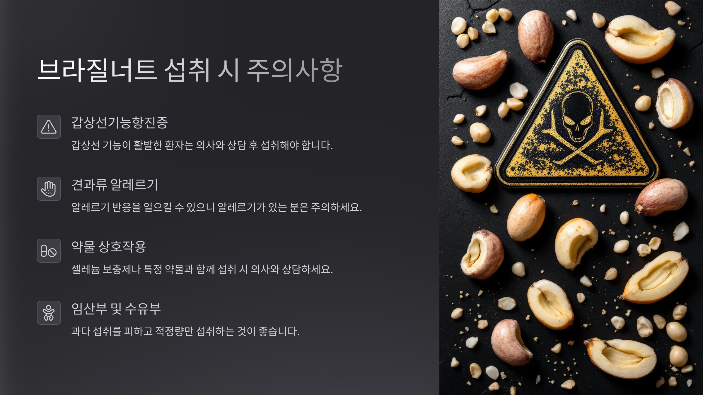 브라질너트가 갑상선에 좋다는 건 분명해요. 하지만 아무리 좋은 것도 ‘과유불급’이에요. 브라질너트에는 셀레늄이 고농도로 들어 있어서, 과하게 섭취하면 오히려 건강을 해칠 수 있어요.