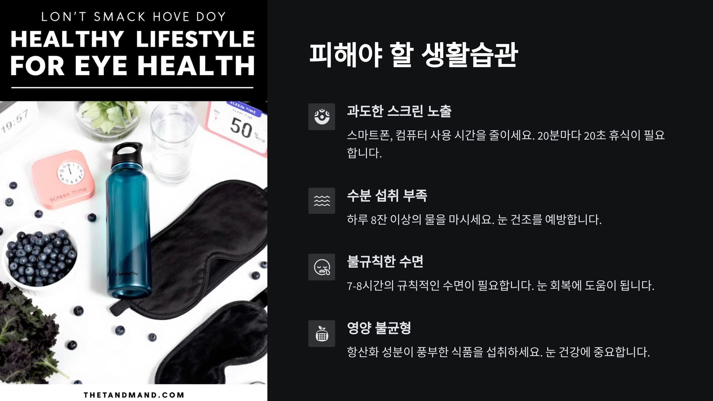 | 불규칙한 수면 | 눈 회복 시간 부족 | 7시간 이상 숙면 확보 |
