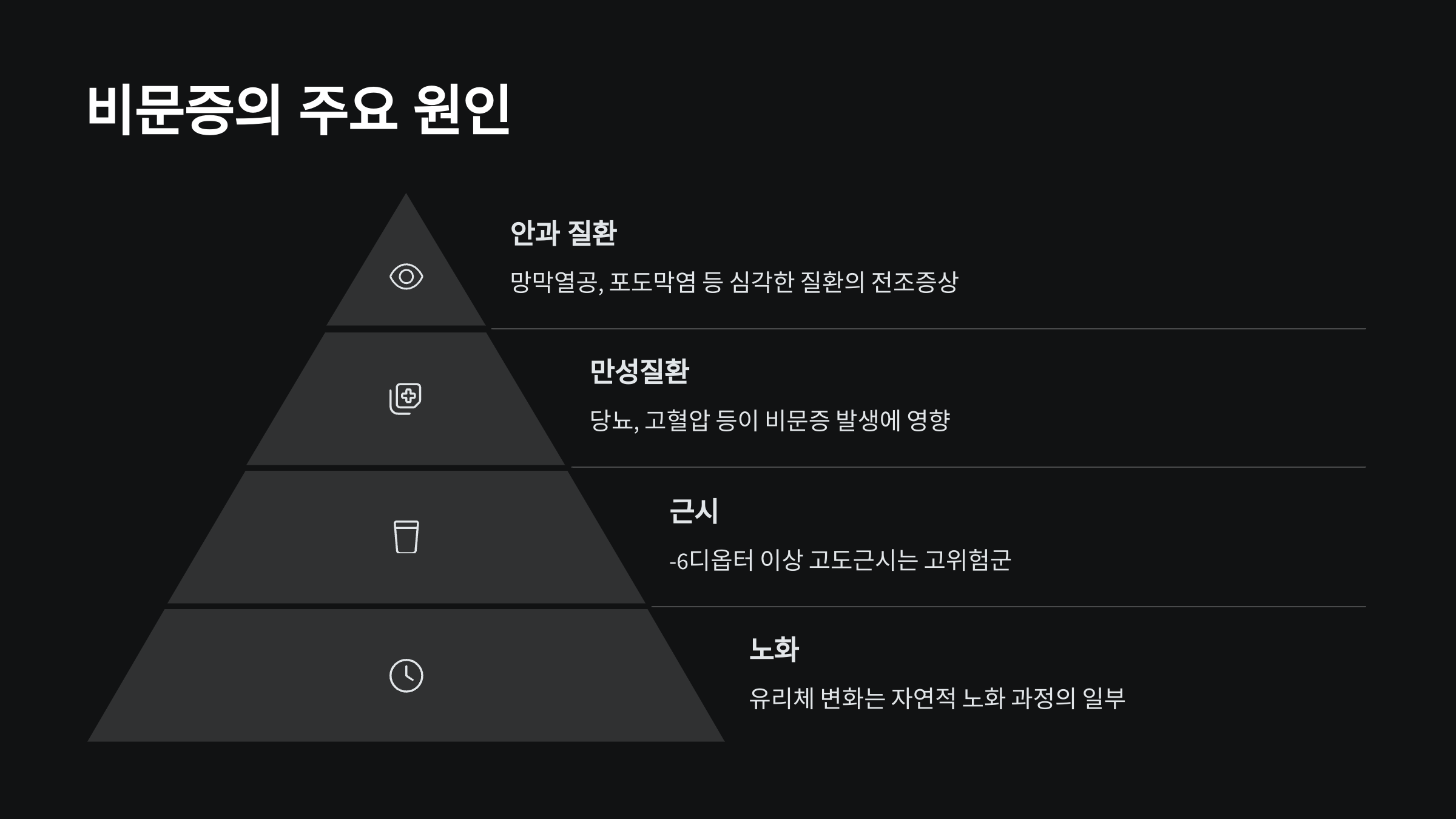 비문증은 대개 유리체(눈 안을 채우는 젤 같은 물질)의 노화로 인해 발생해요. 유리체가 수축하면서 덩어리나 실 같은 부유물이 생기는데, 이게 눈앞을 떠다니는 것처럼 보이는 거죠. 보통은 무해하지만, 급격한 변화가 생긴다면 경고일 수 있어요.