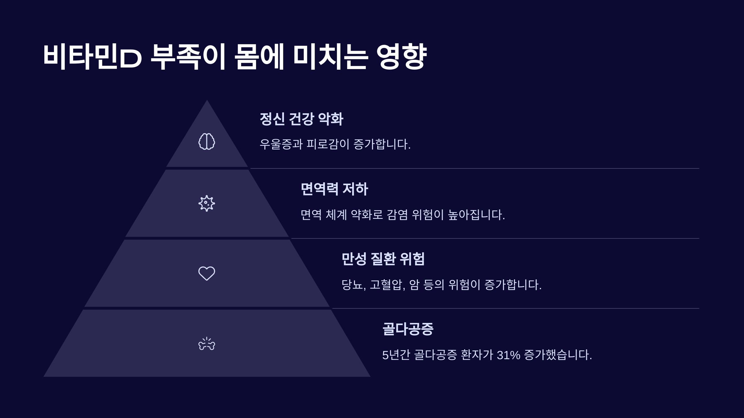 만성적인 비타민D 결핍은 단순한 영양 부족을 넘어서 전신 건강을 뒤흔드는 수준이에요. 실제로 비타민D가 낮으면 제2형 당뇨, 고혈압, 심혈관 질환과도 연관된다는 연구가 많아요.
