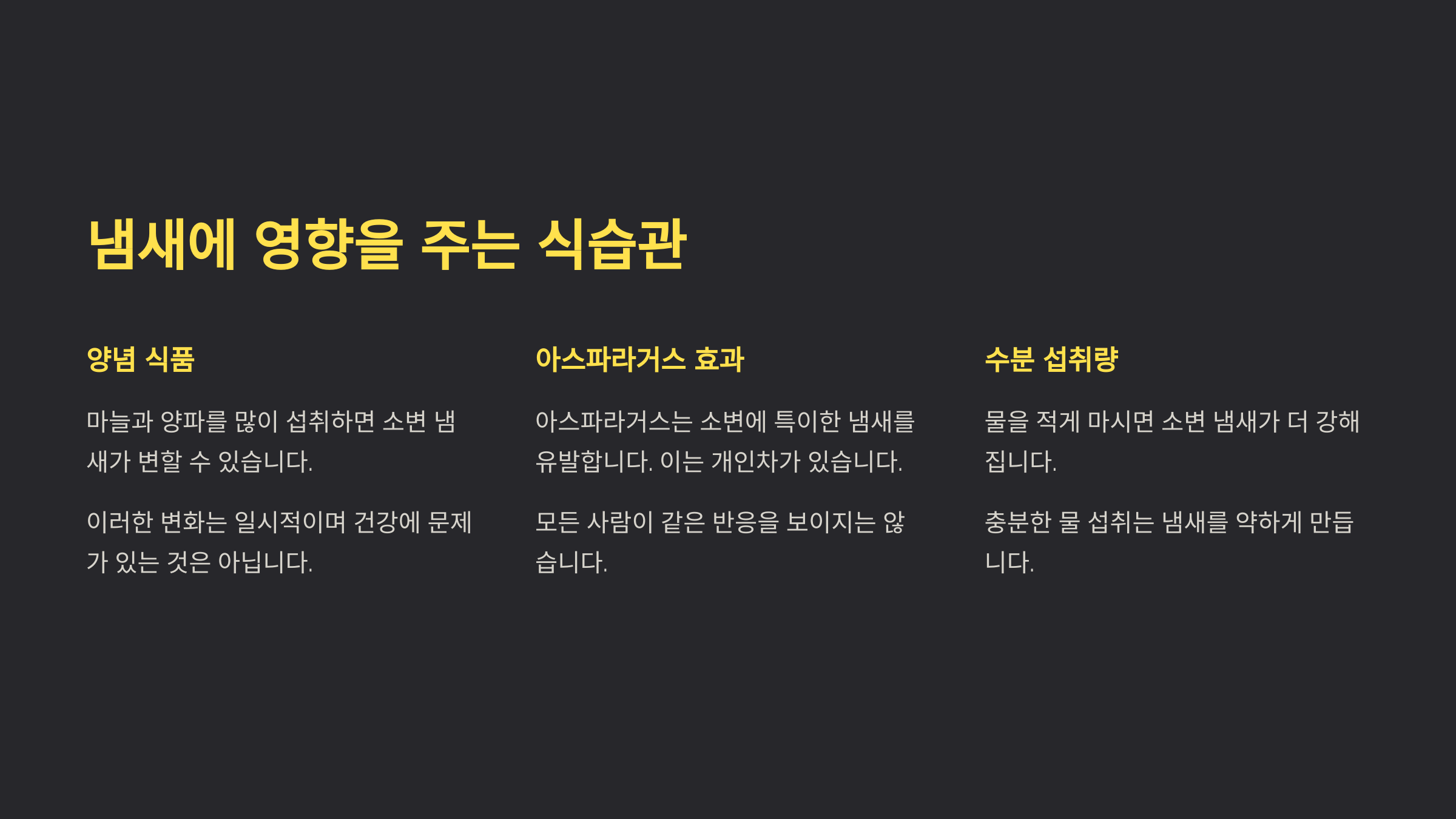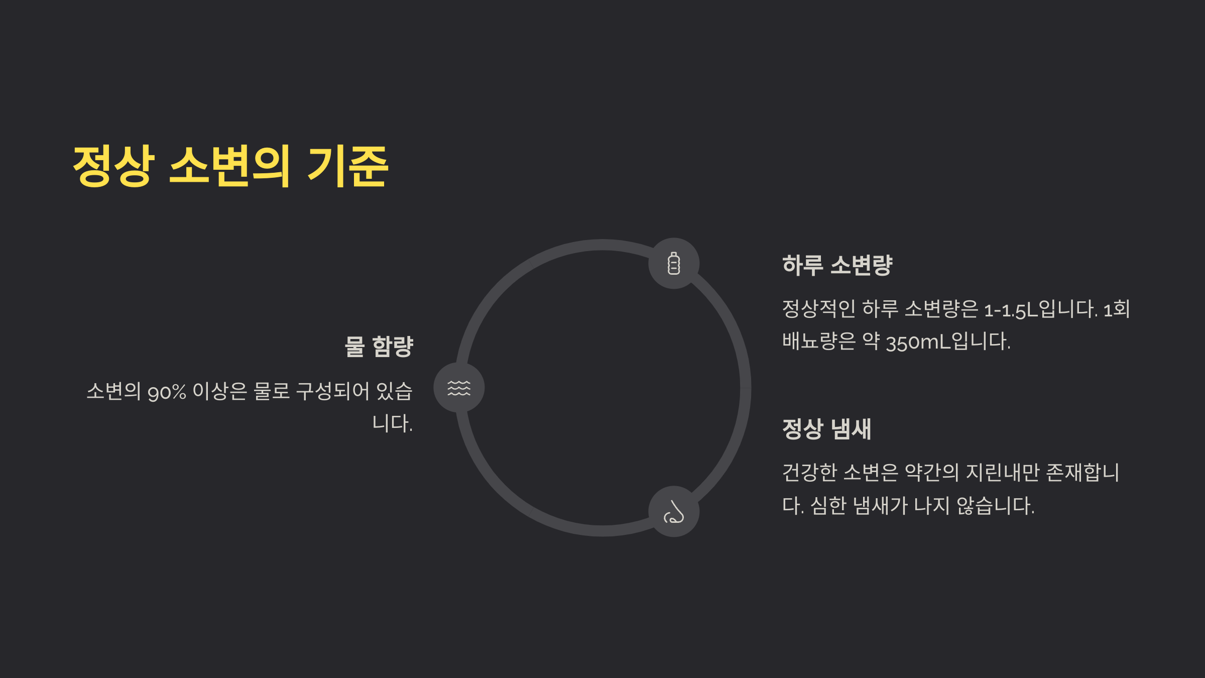 | 진한 노랑 | 수분 부족 | 물을 더 마셔야 함 |