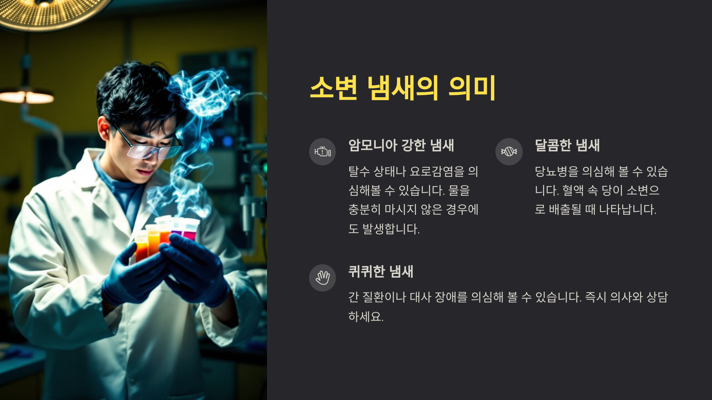 특정 세균이 체내에서 활성화되면 아미노산이나 퓨린이 대사되면서 암모니아 같은 강한 냄새를 유발할 수 있어요. 소변 색이 탁하거나 거품이 심하게 일어난다면 염증 또는 단백뇨 등 신장 관련 질환도 동반되었을 수 있어요. 내가 생각했을 때 이건 놓치지 말고 체크해야 할 신호 같아요.