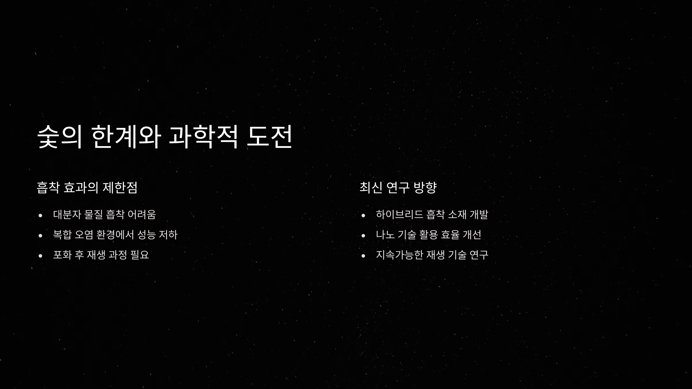 숯이 정말 유용하긴 하지만, 과학자들도 그 한계를 분명히 짚고 있어요. 흡착이란 작용 자체가 ‘일시적’이고 ‘선택적이지 않다’는 점에서 제한이 있다는 거예요. 즉, 다양한 물질을 무작위로 흡착하지만, 그 순서나 우선순위를 조절할 수 없다는 거죠.