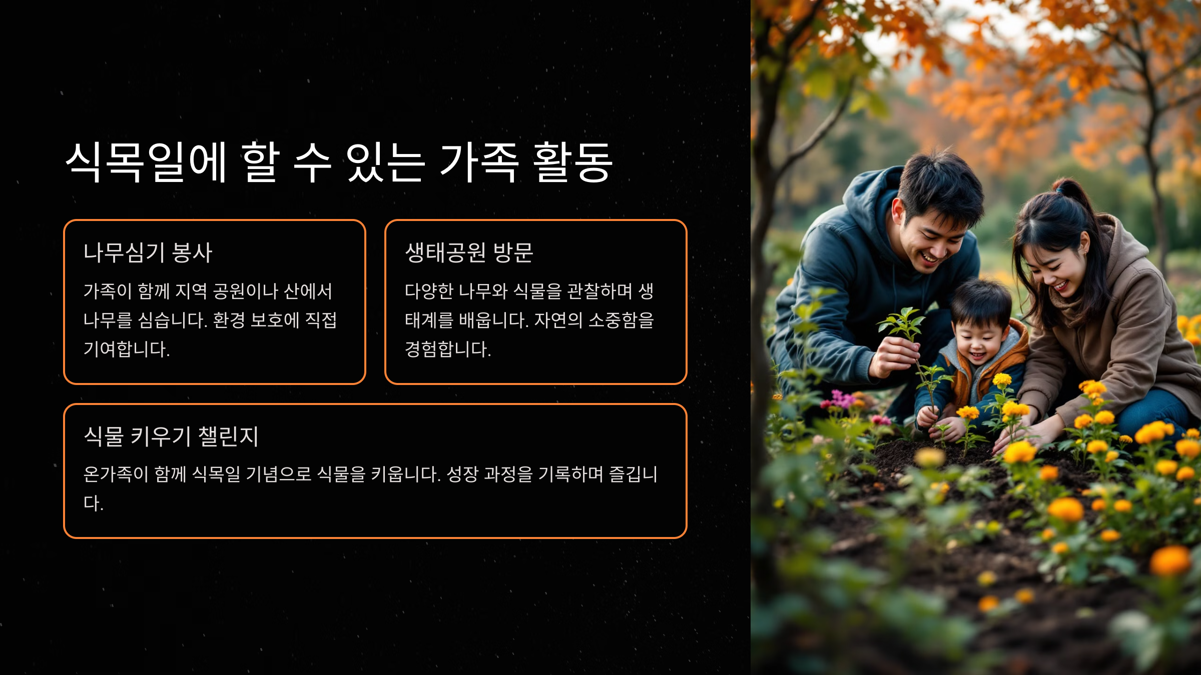 가정에서도 식목일을 활용해 가족 간의 소통과 공동의 목표를 만들어볼 수 있어요. 아이들과 함께 유실수나 꽃나무를 화분에 심고 매일 물을 주며 변화를 관찰하는 건 아주 유익한 가족 활동이에요. 정서 발달에도 도움이 되죠 🪴