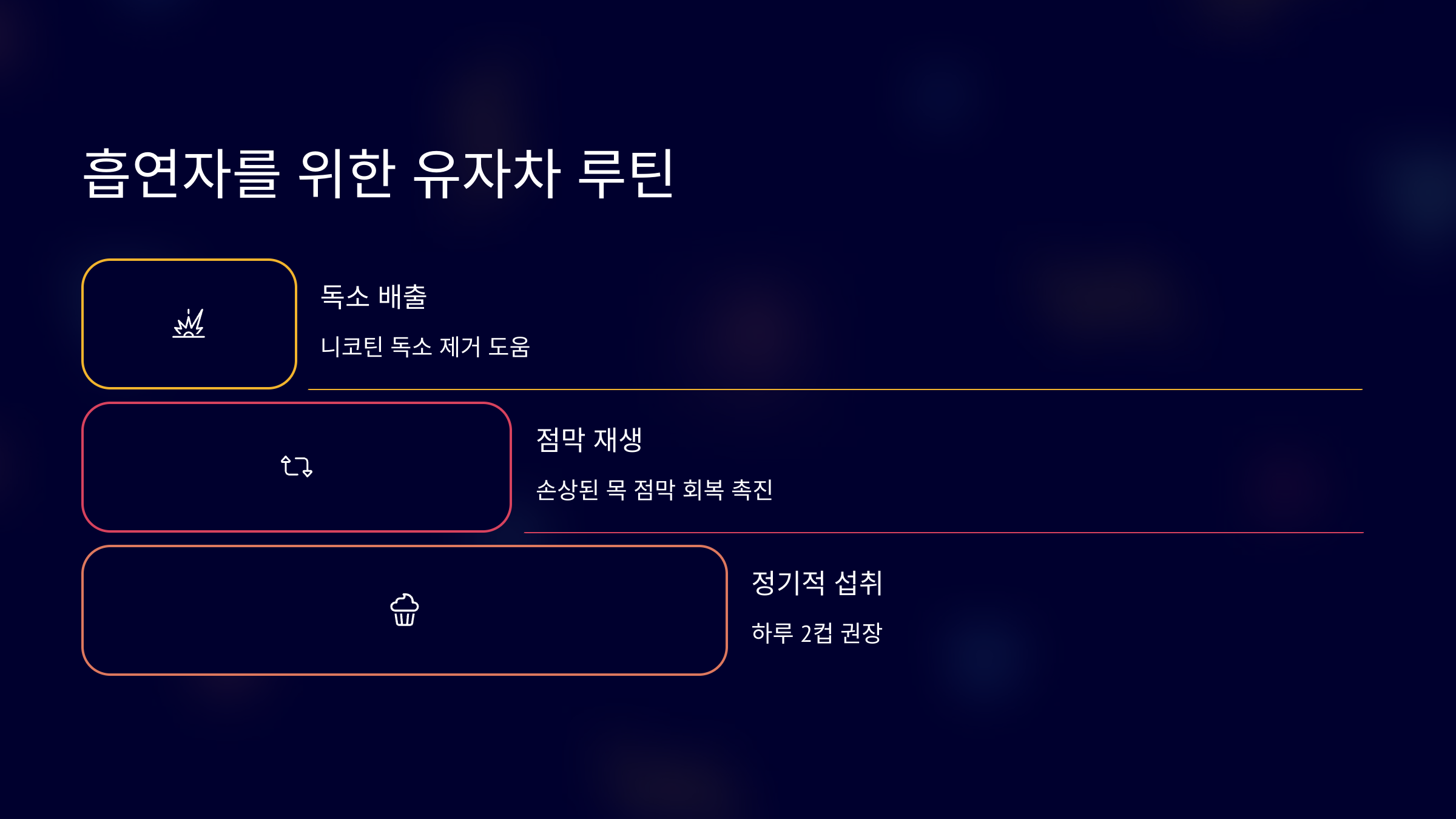 흡연자라면 유자차를 매일 마시는 습관이 더더욱 중요해요. 담배 연기는 목 점막을 지속적으로 자극해 염증을 유발하고, 쉰 목소리나 기침의 원인이 되거든요. 유자차는 그 자극을 줄여주는 데 아주 효과적이에요.