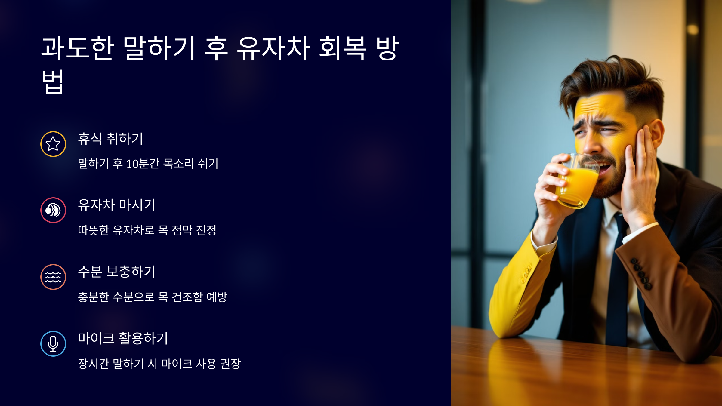꾸준히 이 루틴을 지키면 목소리가 매끄럽고 힘차게 유지돼요. 특히 장시간 발표나 강의 후에도 다음날 목이 쉬지 않아 감탄하게 될 거예요.