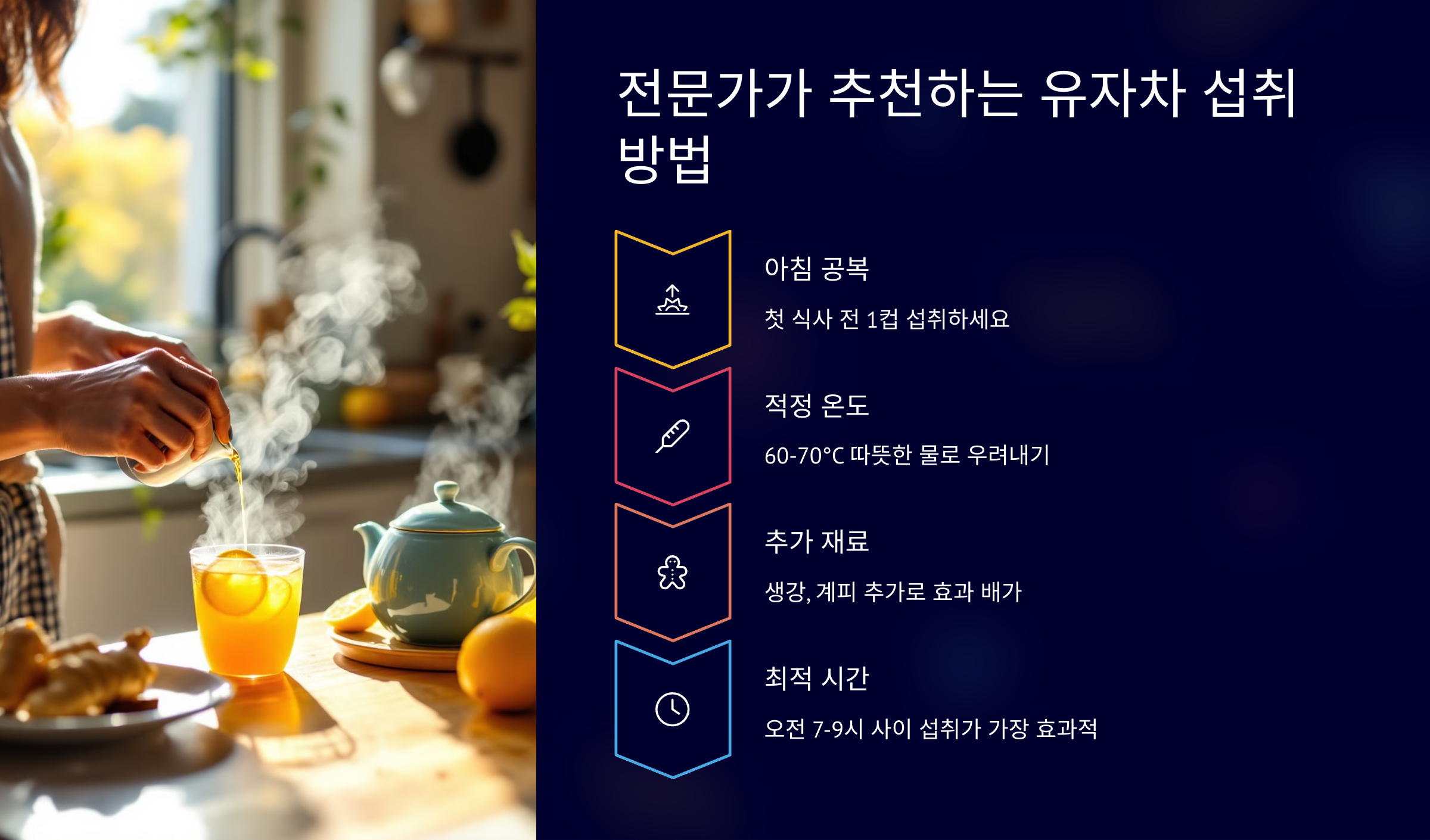 | 저녁 취침 전 | 편안한 수면, 염증 예방 | 유자청 + 생강 슬라이스 추가 |