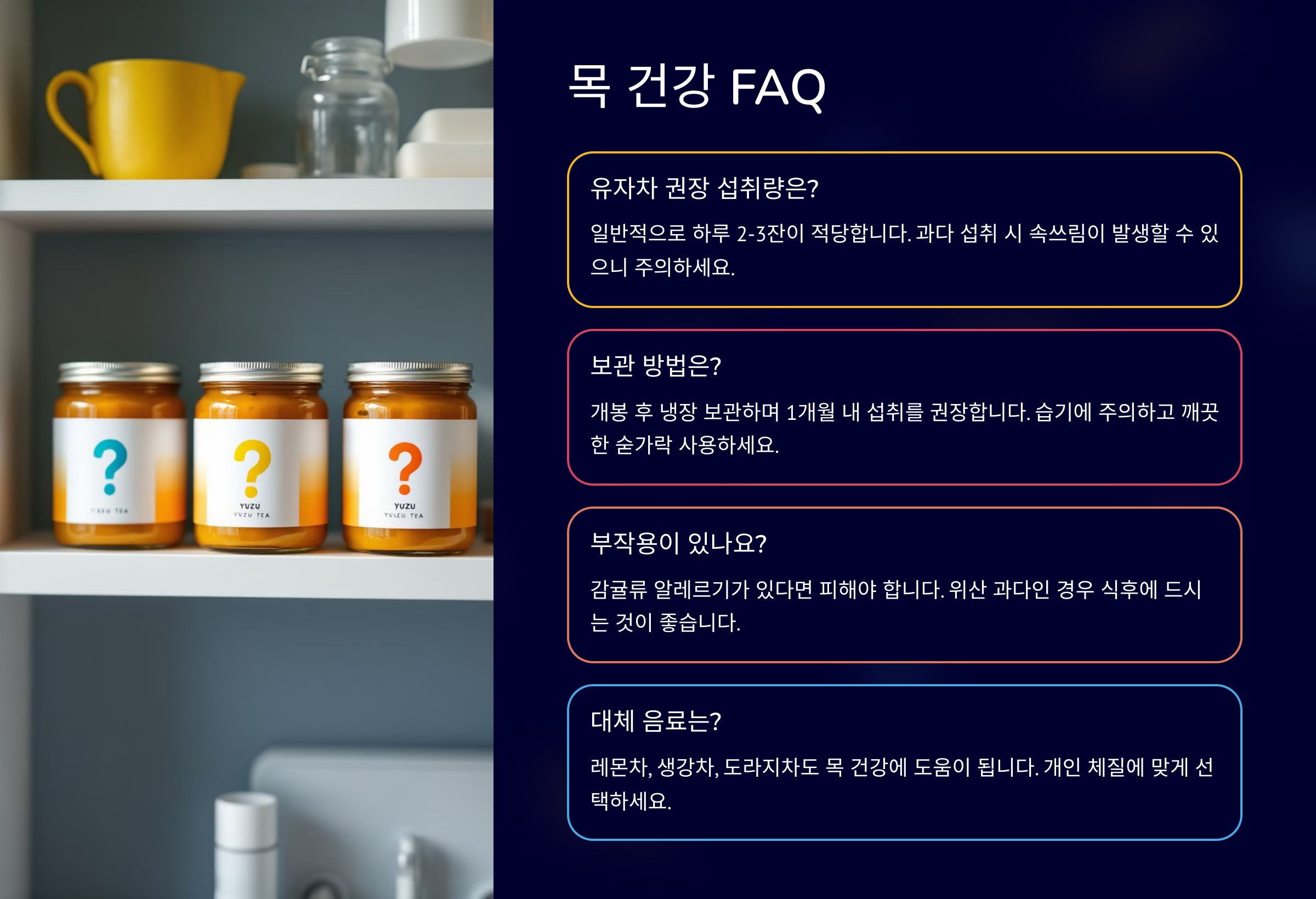 유자차는 단순히 달달한 음료가 아니에요. 꾸준히 마시다 보면 "왜 목 건강에 좋다고 했는지" 몸이 먼저 느끼게 될 거예요.
