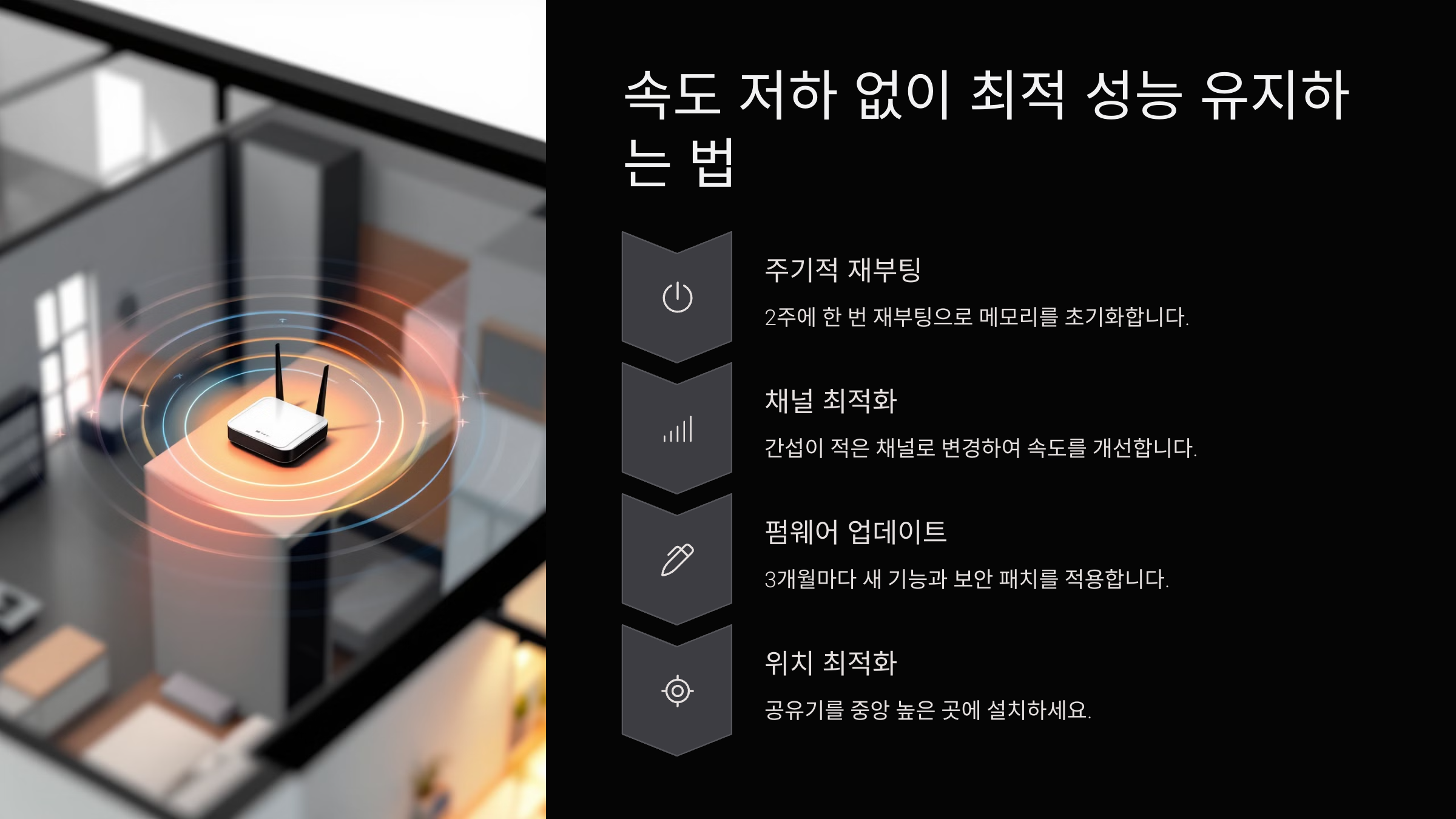 🔄 정기적인 재부팅: 공유기를 장기간 켜두면 메모리가 쌓여 속도가 느려질 수 있어요. 일주일에 한 번 정도 전원을 껐다가 다시 켜면 최적의 성능을 유지할 수 있어요.