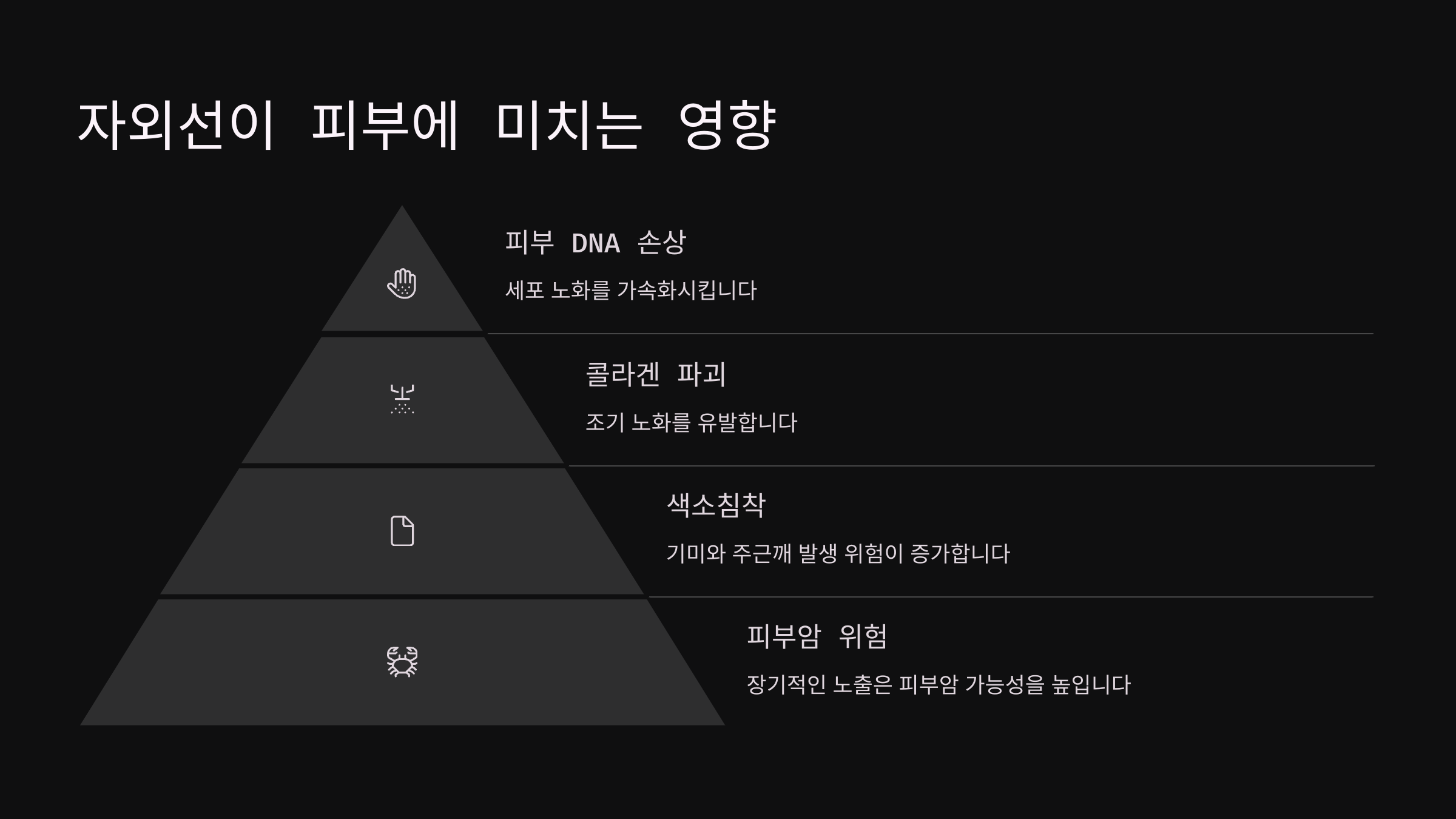 장기적으로 자외선에 과다 노출되면 콜라겐과 엘라스틴이 파괴되어 피부 탄력이 떨어지고 주름이 생겨요. 색소세포의 반응으로 기미나 잡티가 늘어나는 것도 흔하답니다. 피부암의 주요 원인으로도 알려져 있어서 정말 조심해야 해요.