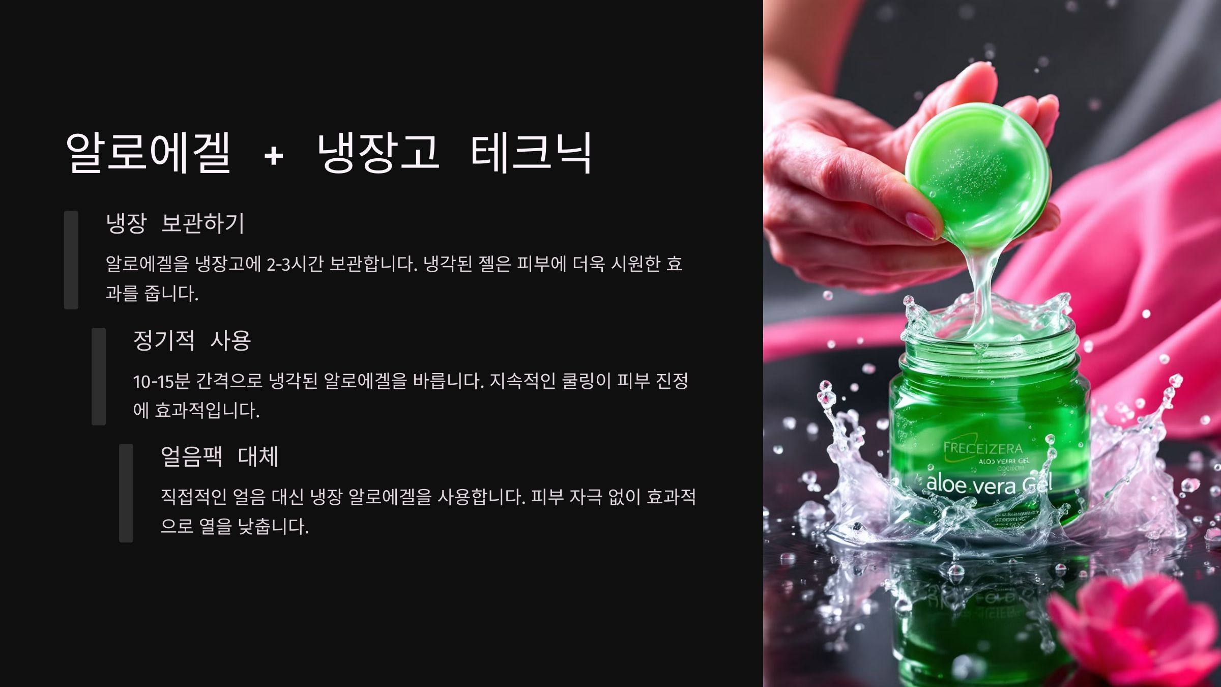 냉찜질을 할 때는 수건에 얼음팩을 감싸 피부에 살짝 대주는 식으로 사용해요. 직접 얼음을 대면 피부가 더 자극받을 수 있으니 주의해야 해요. 이때 알로에겔을 함께 사용하면 시원함과 보습이 동시에 가능해요.